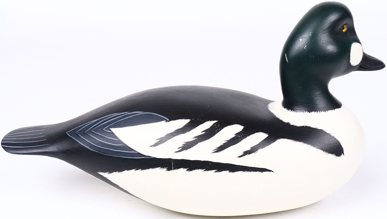 Goldeneye Drake by Ray Miller, Paul S. Boro, N.J. glass eyes, hollow wood, original paint, structurally excellent, branded RM and signed on bottom. Grade: MINT - Value: 30 to 60