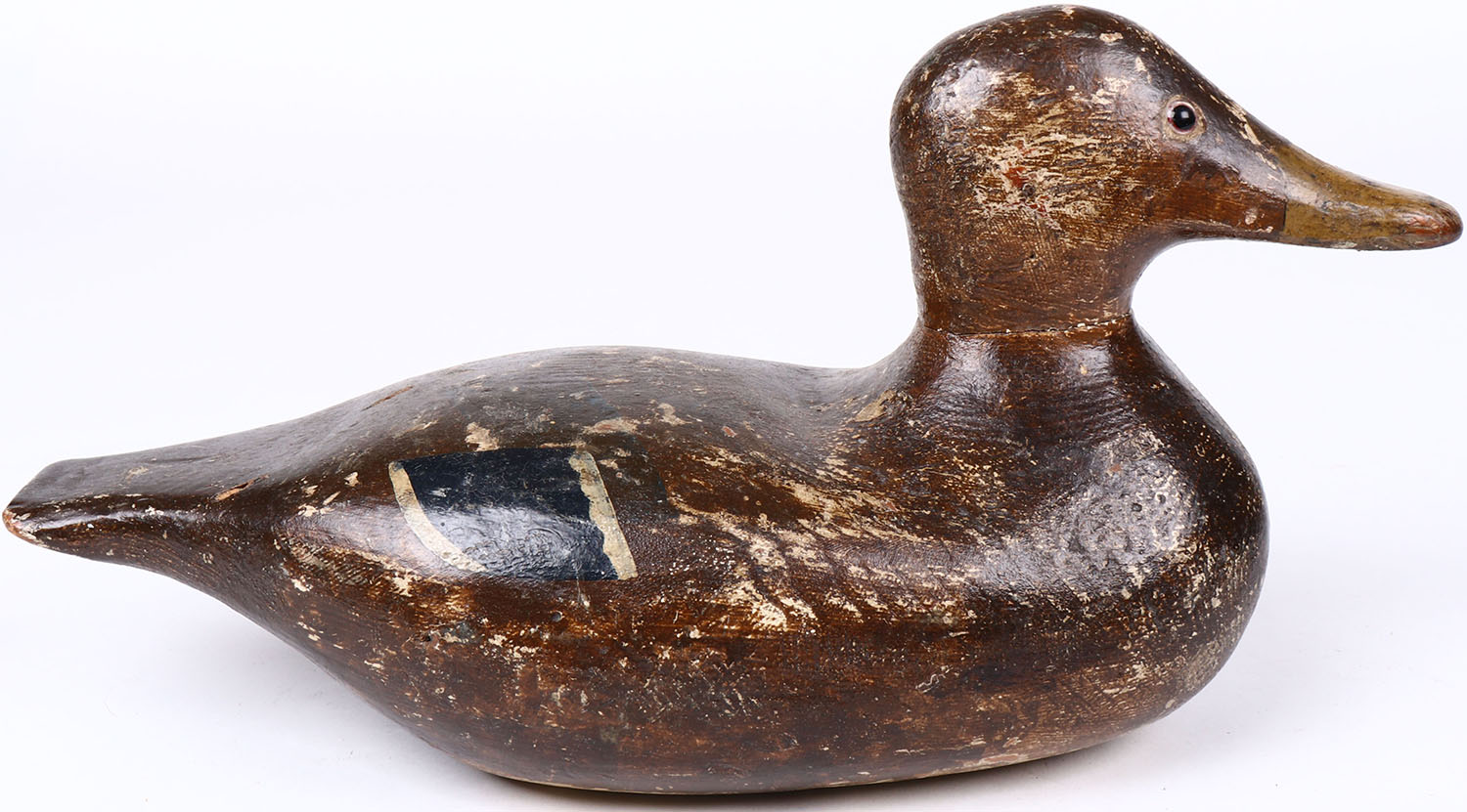 Black Duck by unknown maker, glass eyes, solid wood, original paint, has age crack on bottom. Grade: Excellent - Value: 50 to 100
