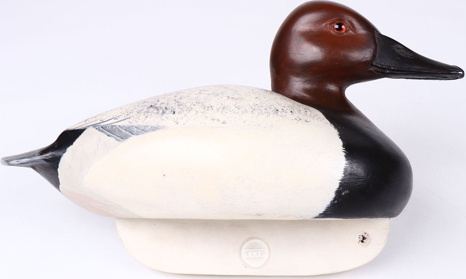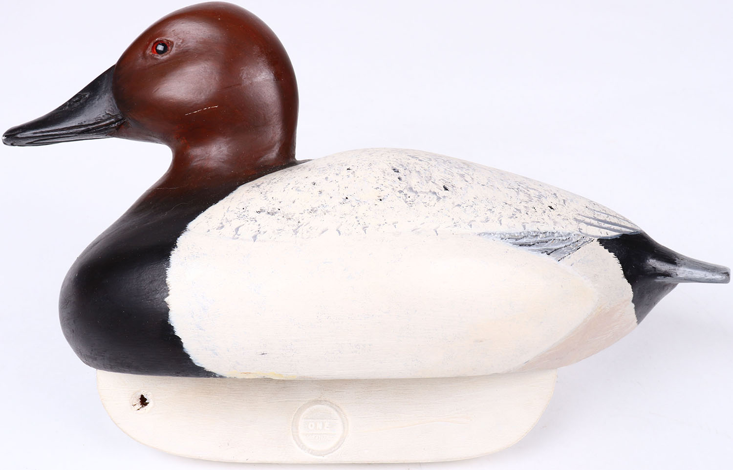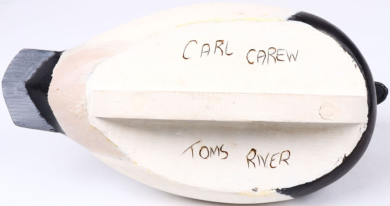 Canvasback Drake by Carl Carew, Toms River, glass eyes, hollow wood, original paint, structurally excellent, signed on bottom. Grade: MINT - Value: 30 to 60