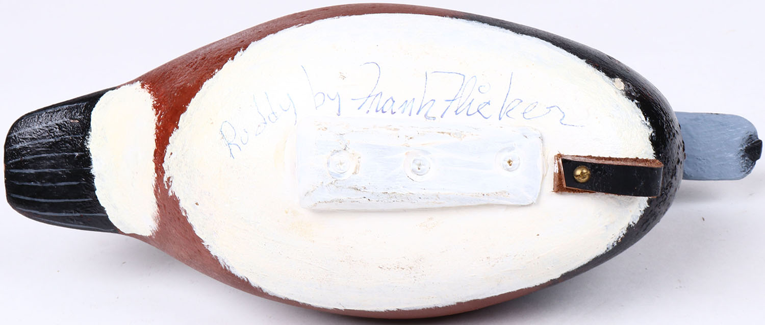 Ruddy Duck Drake by Frank Thicker, glass eyes, hollow wood, original paint, structurally excellent, signed on bottom. Grade: MINT - Value: 40 to 80