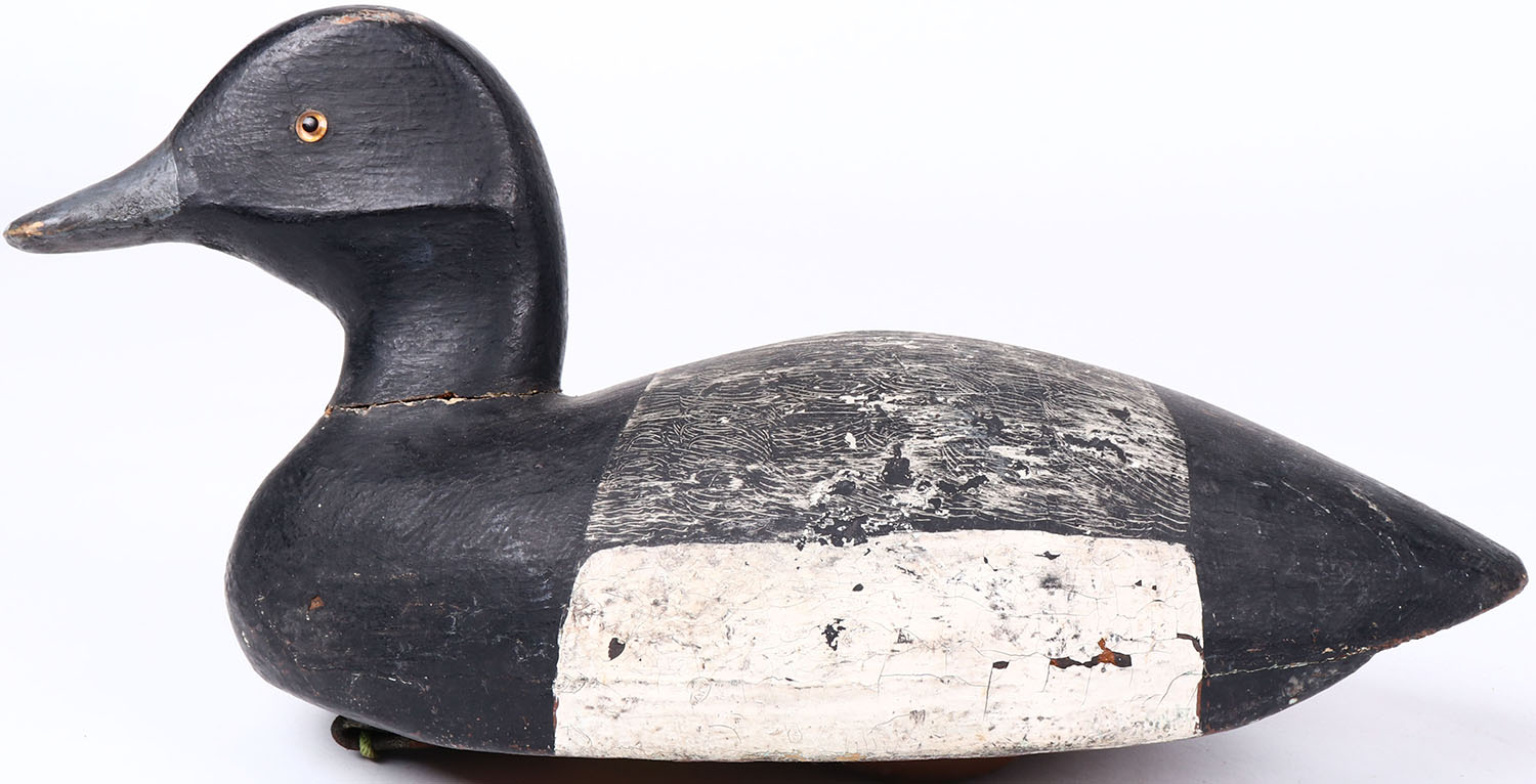 Bluebill Drake by unknown maker, glass eyes, solid wood, original paint with comb painting, structurally excellent. Grade: Excellent + - Value: 50 to 100
