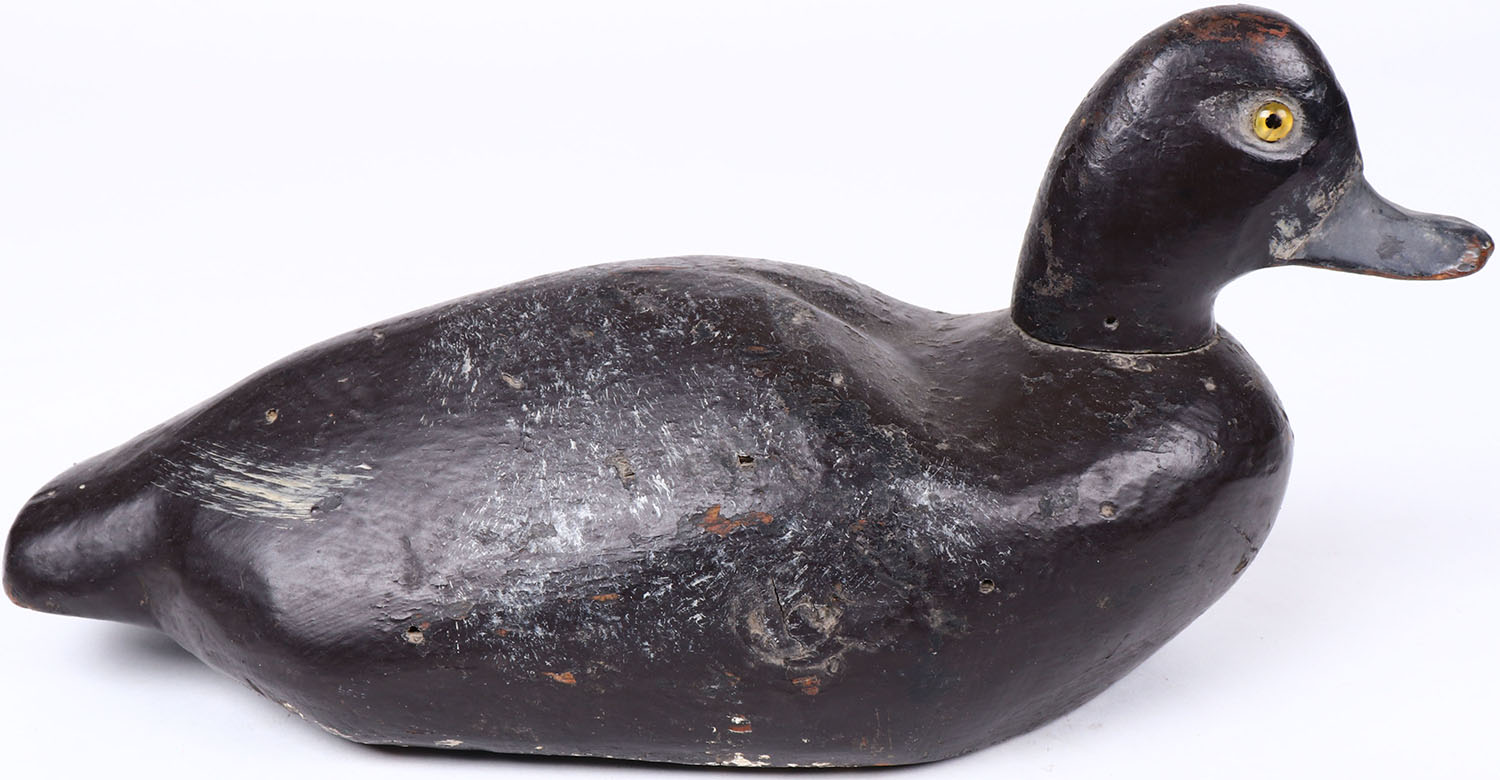 Bluebill Drake by unknown maker, glass eyes, solid wood, original paint, has hairline age crack on bottom. Grade: Excellent - Value: 40 to 80