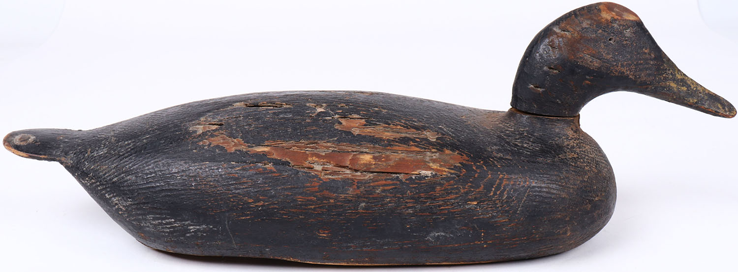 Black Duck by unknown maker, painted eyes, hollow wood, original paint, has age cracks on entire body, head is loose. Grade: Very Good ++ - Value: 30 to 60