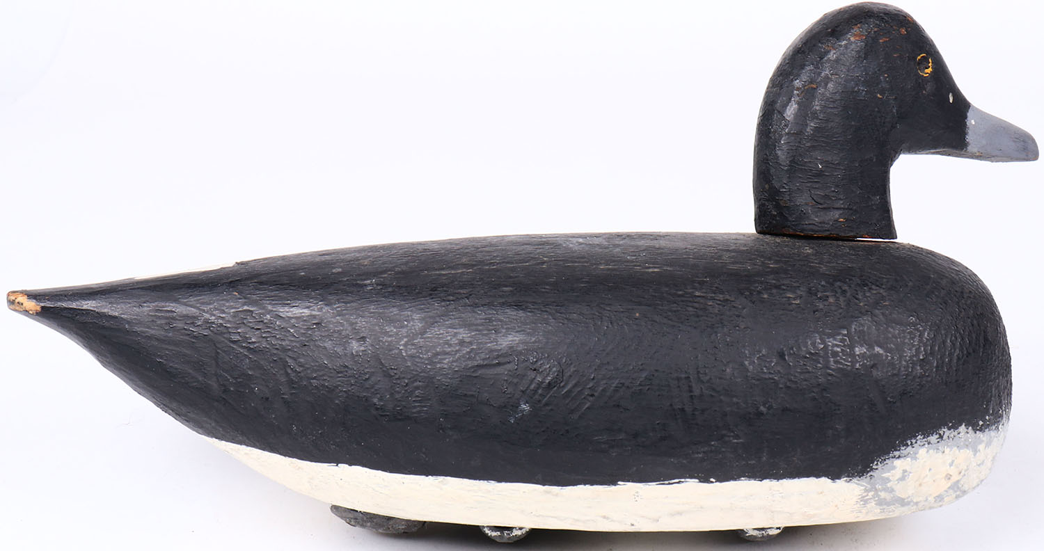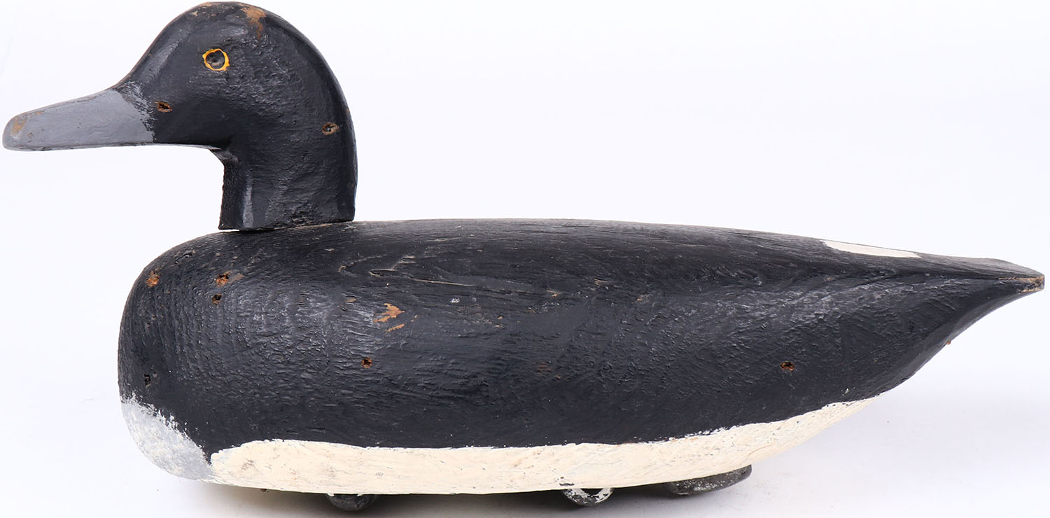 Bluebill Drake by unknown maker, eyes are missing, solid wood, original paint, has age cracks on bottom, head is loose. Grade: Very Good + - Value: 30 to 60