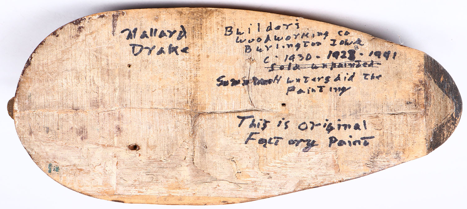 Mallard Drake by Buildori Woodworking, Co, Burlington, Iowa, tack eyes, solid wood, original paint, structurally excellent, signed on bottom. Grade: Very Good ++ - Value: 100 to 200