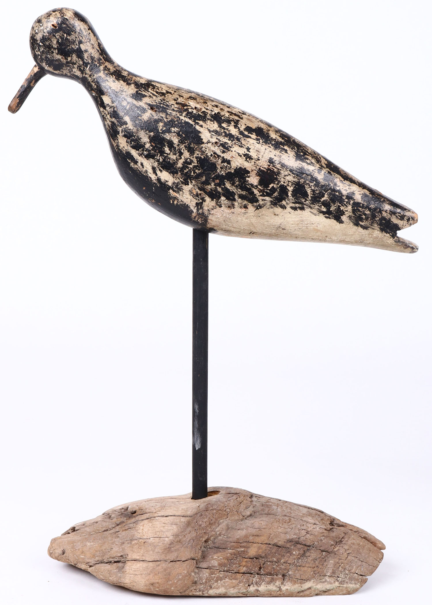 Shorebird by unknown maker, painted eyes, solid wood, on wood stand. Grade: Excellent - Value: 150 to 300