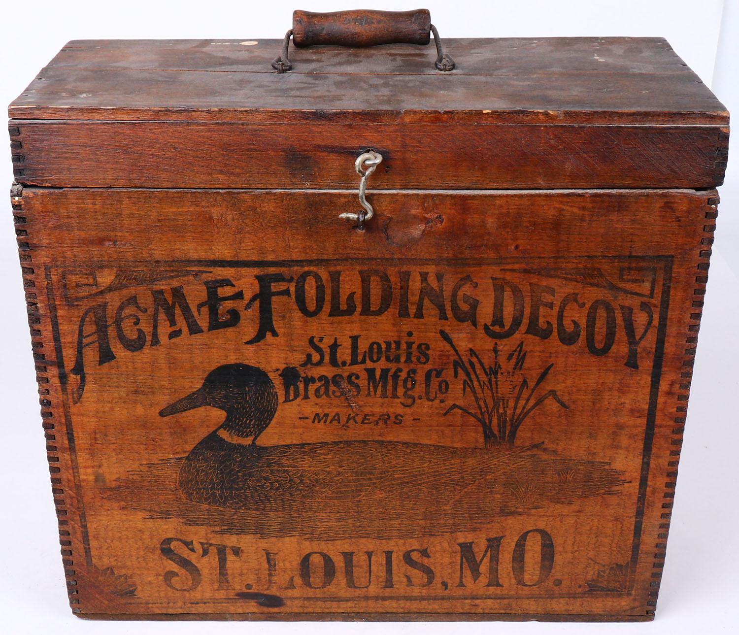 VERY RARE, Empty Acme Folding Decoy Co, St. Louis Brass Mfg. Co, St. Louis MO. Wood box. Grade: Excellent ++ - Value: 30 to 800