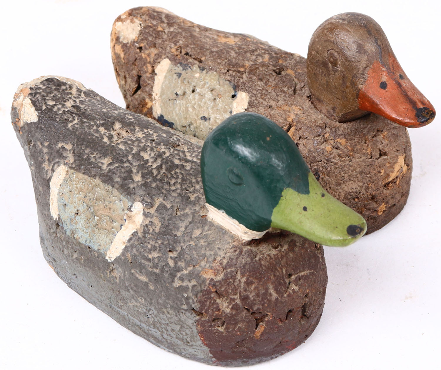 Pair of miniature Mallards by unknown maker, painted eyes, cork body, orignal paint, structurally excellent. Grade: Excellent + - Value: 30 to 60