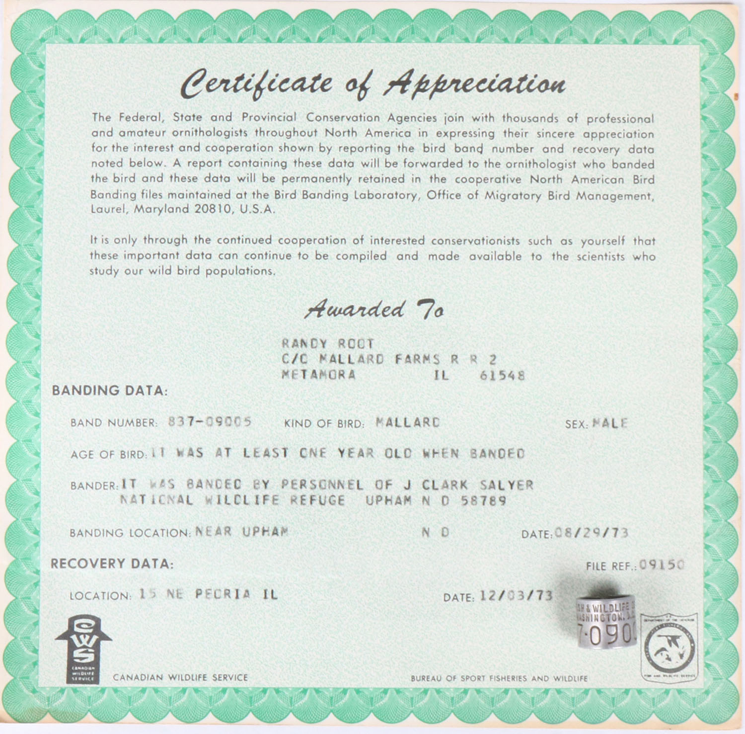 DUCK BAND with certificate from 1966, we are offering a few duck bands with an opportunity to all bands that were all shot at one duck club in Peoria IL from 1964 - 1999, ''MALLARD FARMS R R 2'', over 60 bands available to the highest bidder, each one has a certificate, some ducks were over 10 years old, rare opportunity to many duck bands with cert. all from on duck club, this one was banded in ND 08/29/1973 and shot 12/03/1973. Grade: Excellent - Value: 30 to 100
