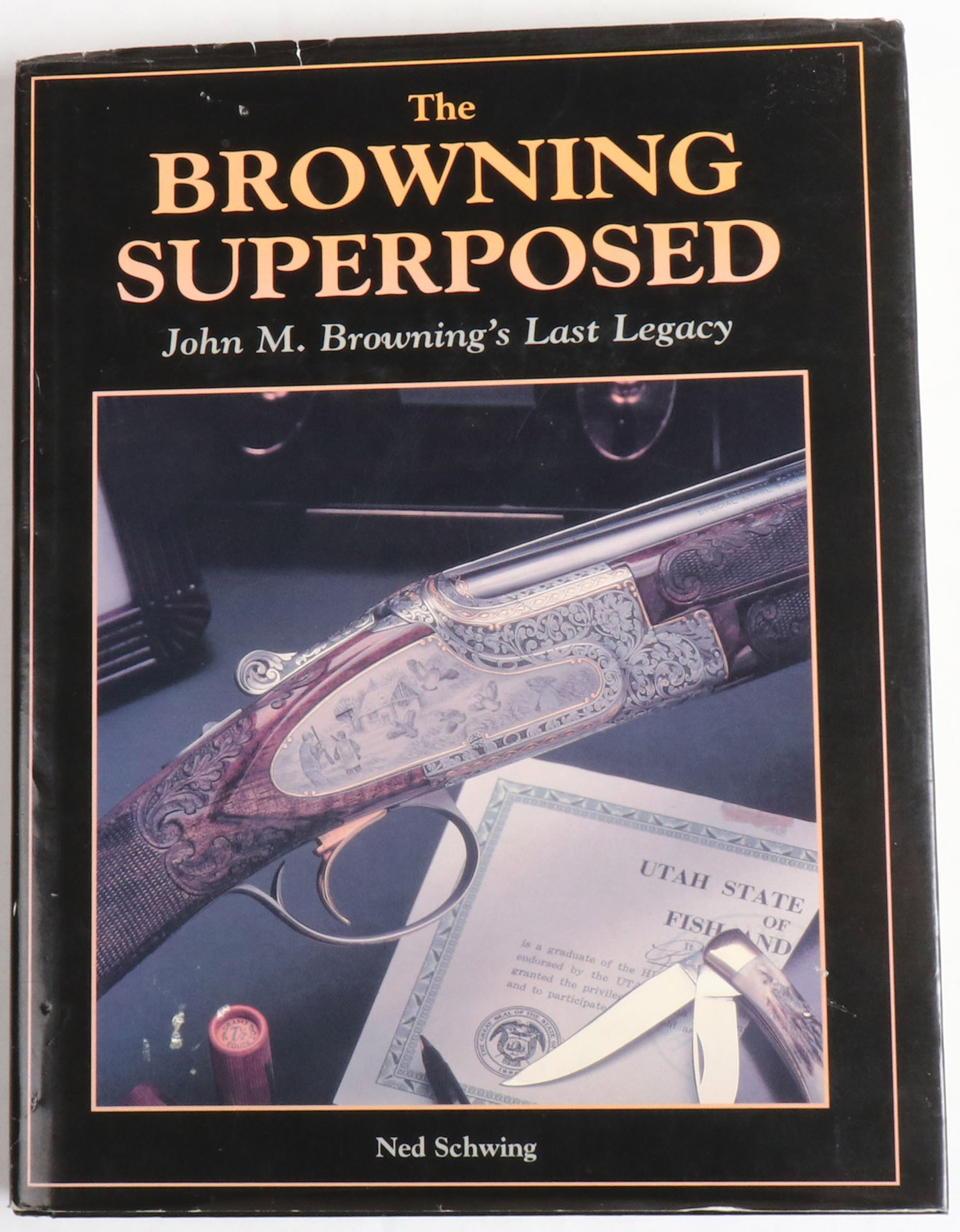 The Browning Superposed: John M. Browning's Last Legacy by Ned Schwing 1996, 8 1/2'' x 11''. 496 pages, pages clean, binding tight, hardcover very good, dustjacket has some tears in it, b/w and colored images. Value: $850 Grade: Excellent + - Value: 20 to 200