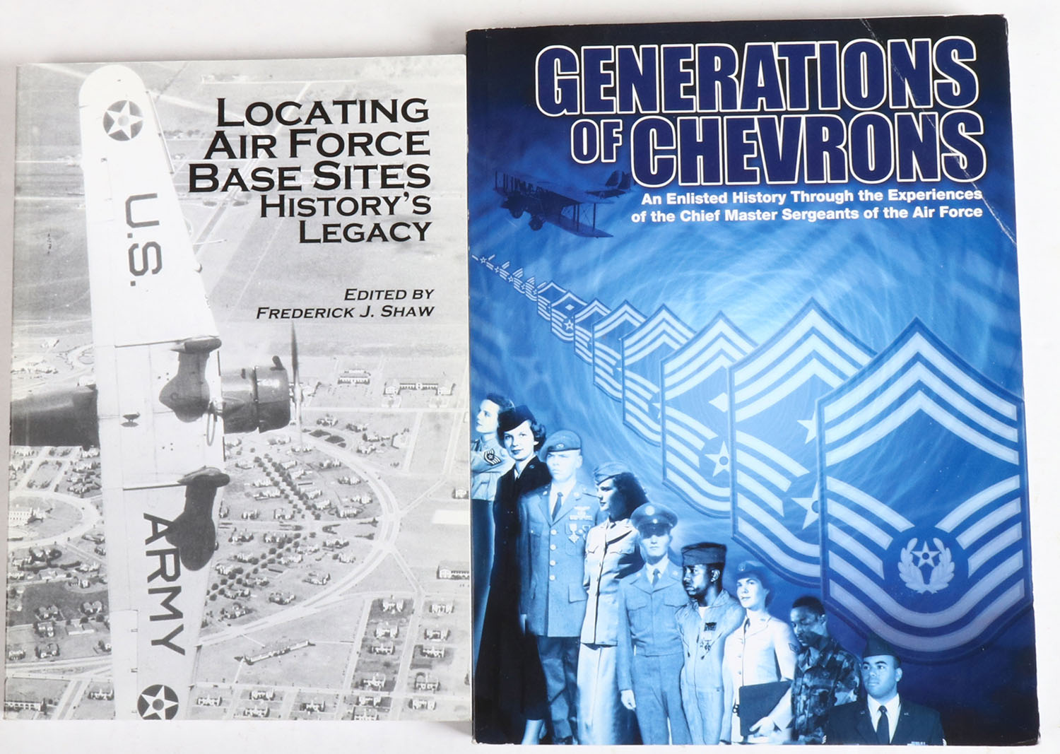 Lot of 2 (1) Generations of Chevrons: An Enlisted History Through the Experiences of the Chief Sergeants of the Air Force, 7 1/2'' x 10''. 242 pages. (1) Locating Air Force Base Sites History's Legacy by Fredrick J. Shaw, 6 1/2'' x 9 1/2''. 215 pages. Grade: Very Good ++ - Value: 2 to 60