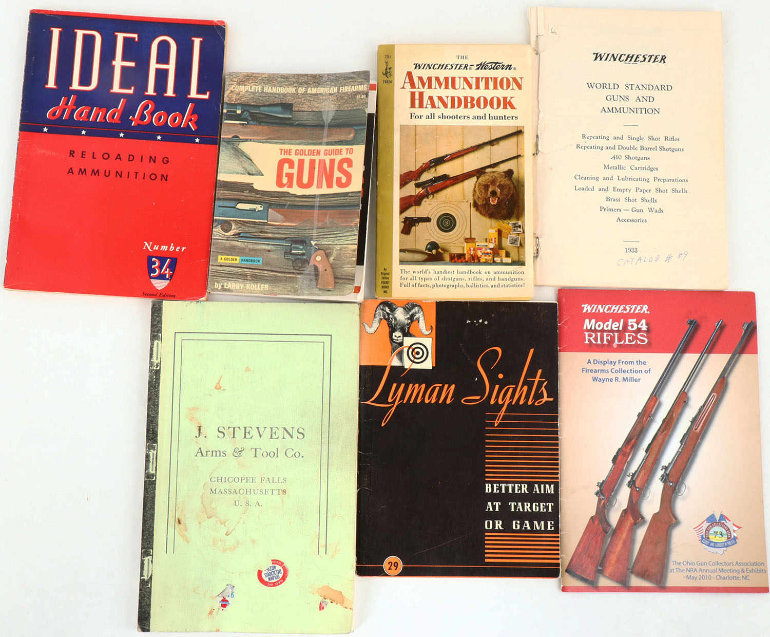 Lot of 7 (1) Ideal Hand Book: Reloading Ammunition Number 34 1942, 5 1/2'' x 7 1/2''. (1) The Golden Guide To Guns by Larry Koller, 4'' x 6''. (1) The Winchester-Western Ammunition Handbook For all shooters and hunters, 4'' x 7''. (1) Winchester Model 54 Rifles, 5 1/2'' x 8''. (1) Winchester World Standard Guns and Ammunition 1933 Catalog Number 89, 5'' x 7 1/2''. (1) J. Stevens Arms & Tool Co. Catalog No. 51, 5 1/2'' x 8 1/2''. (1) Lyman Sights 1943, 5'' x 7''. Grade: Very Good ++ - Value: 2 to 50
