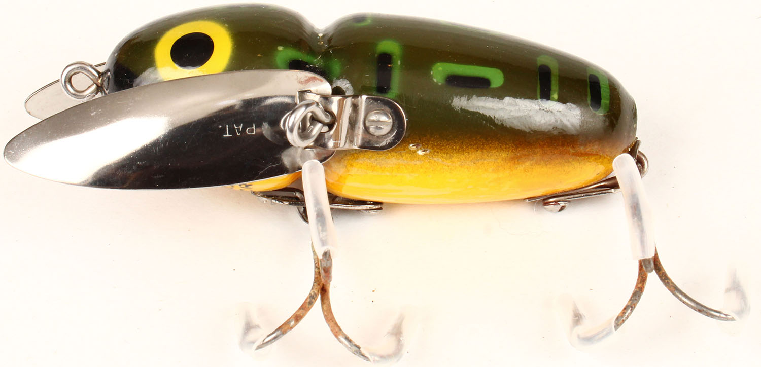 Heddon Crazy Crawler, wood lure, PE, frog pattern, 2 hooks, surface rig. Grade: Excellent ++ - Value: 20 to 75