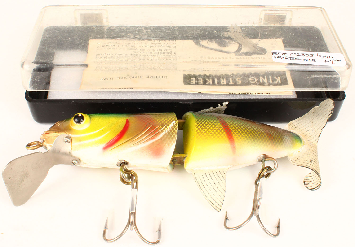 Natural lure bait co., Jointed King Size lure in the original box, green, PE, metal lip, 2 hooks. Grade: Excellent - Value: 10 to 50