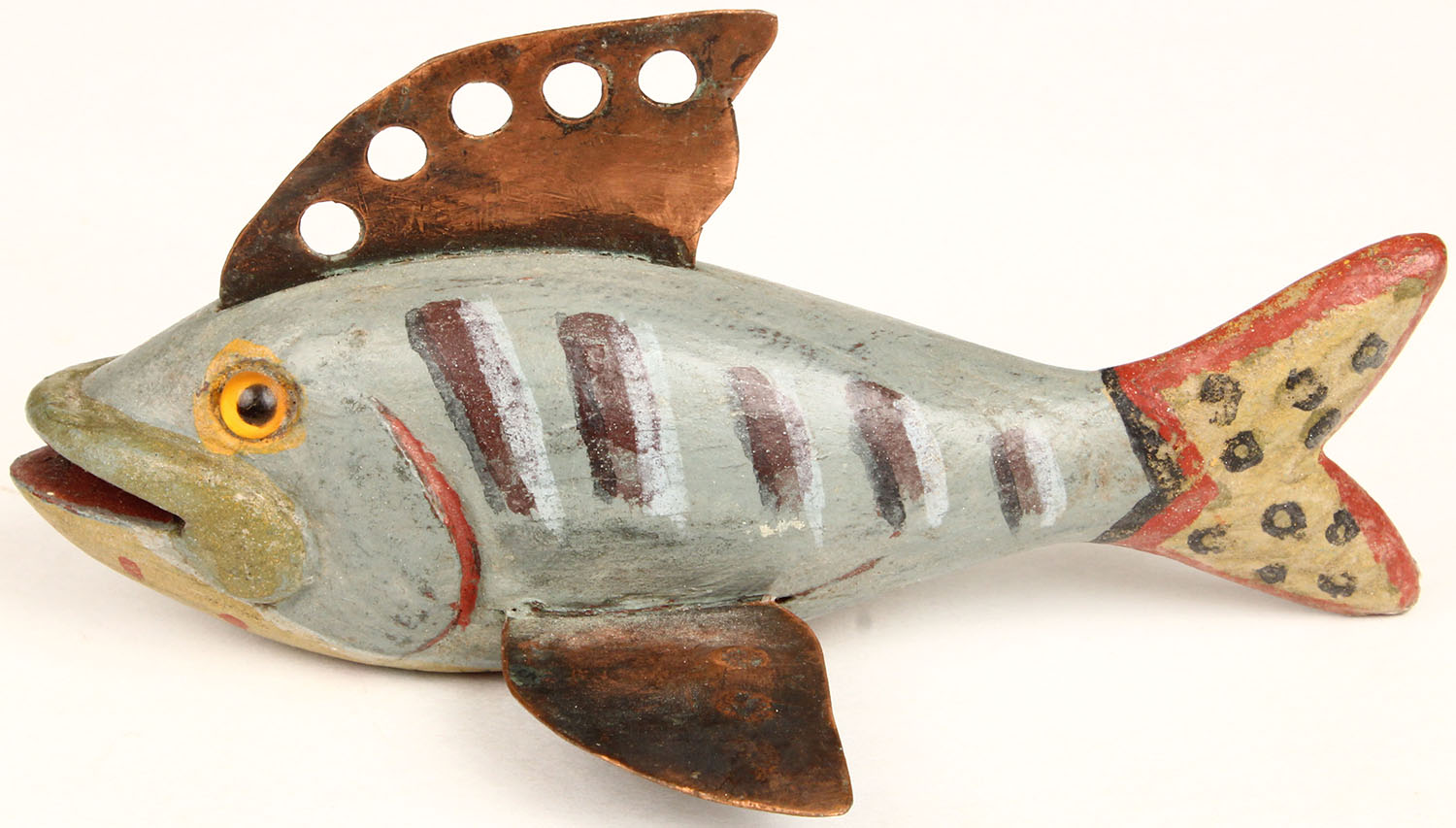 | J.J. Hildreth Ice Fishing Decoy, GE, 5 line ties, has 3 metal fi...