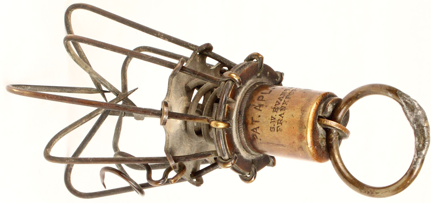 Very Rare S.W. Evans & Son fishing trap - EAGLE CLAW spring loaded snare or fish trap patented in 1877. This fishing trap is in very good condition and is functional as shown for the intended purpose. It has all 8 hooks that spring close once the trigger is tripped, made of brass, 3 1/2'' OAL, spring mechanism is stamped: PAT. APL. 17-77 S.W. EVANS & SON FRANKFORD Pawell marked. Grade: Very Good ++ - Value: 100 to 500