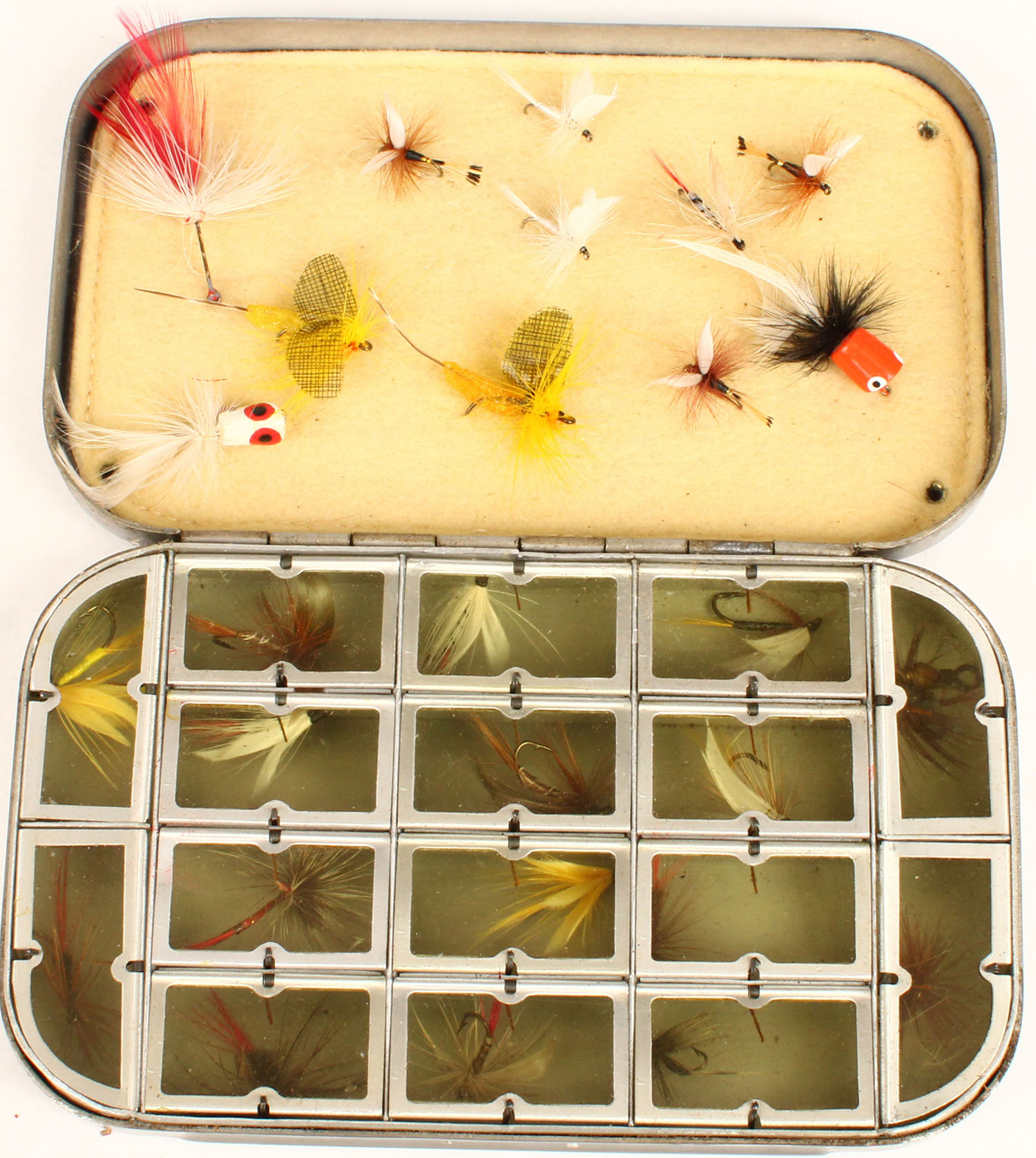 | Richard Wheatly fly box, 2 sided, full of flies. Grade: MINT -...