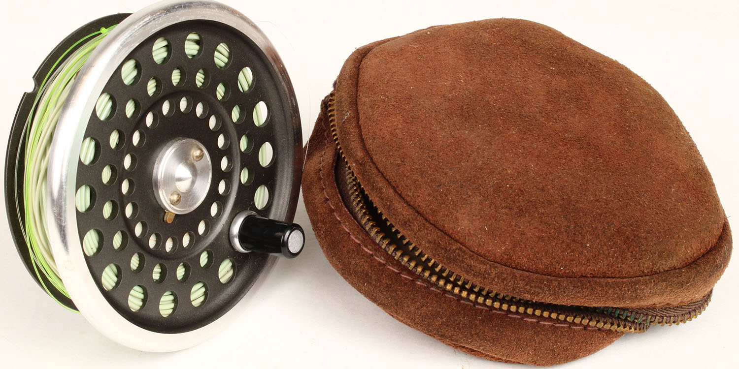 | Wulff Fly Spool with leather pouch, 3 1/4''. Grade: Excellent...