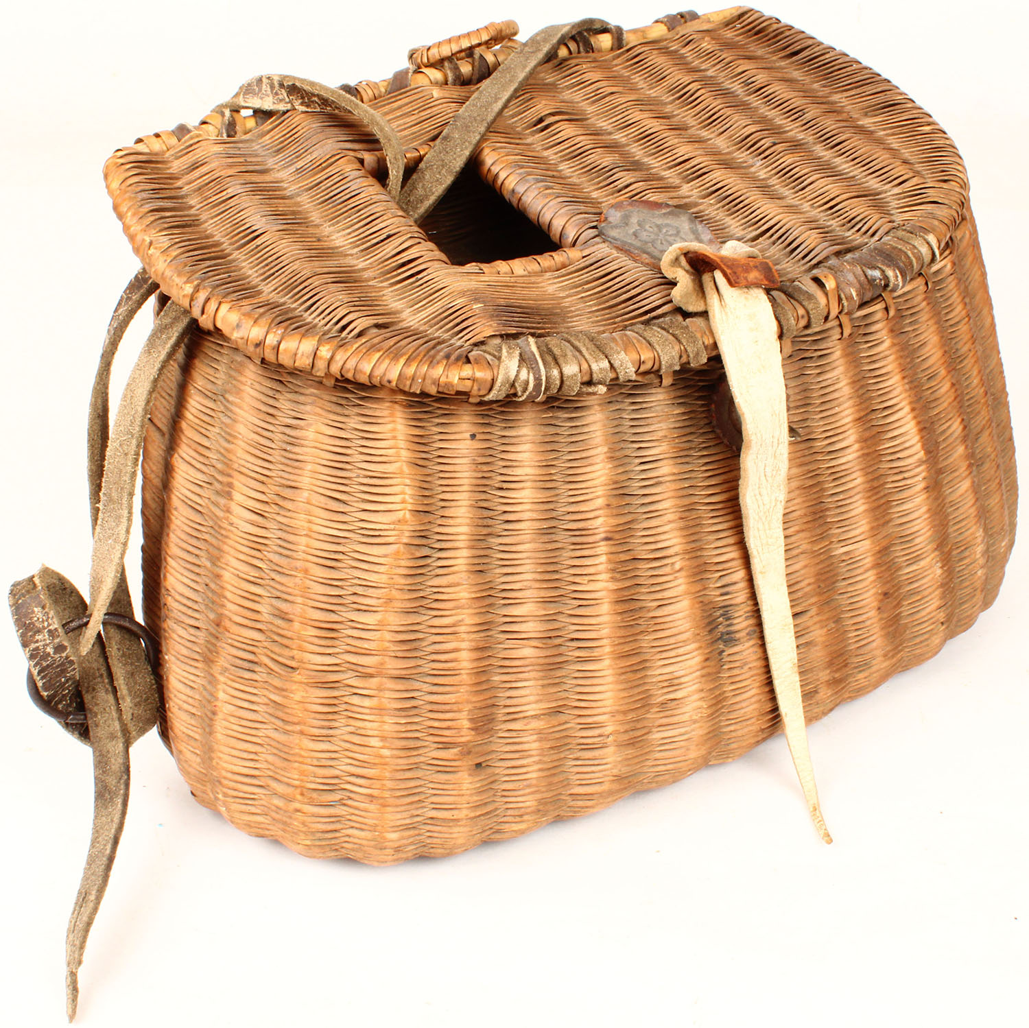 Unmarked Fishing creel, buckle is attached with repair to strap, 12'' at base, weave on basket has no damage, nice creel. Grade: Very Good ++ - Value: 10 to 60
