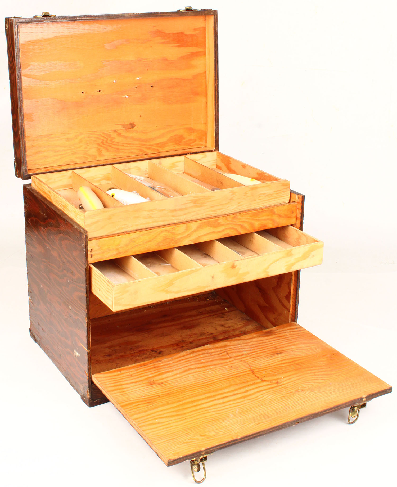 Semco wood fishing tackle box with a few lures inside, 16'' wide. Grade: Excellent - Value: 10 to 60