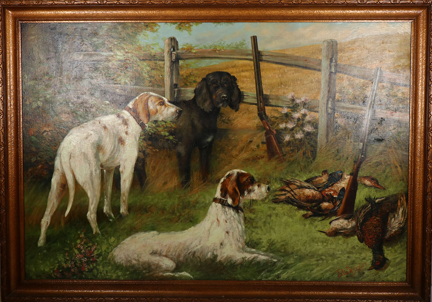 Original Oil on board by F.A. Sprinqer pictures three hunting dogs near fence line with two double shotguns on fence, shows the days success with ducks, woodcocks & rooster pheasant, 6' x 4' image size, VERY LARGE, Exceedingly rare center piece for any man cave/hunting cabin, original frame is thick & well made. Grade: Excellent + - Value: 1000 to 10000