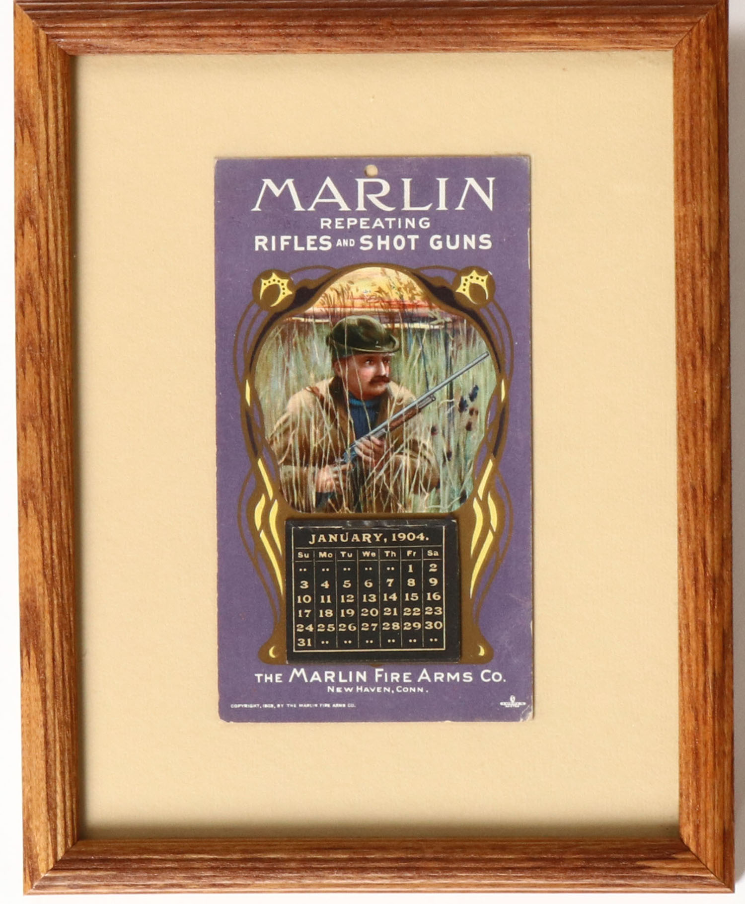 1904 Marlin Fire Arms Co. Mini Calendar, ''Repeating, Rifle and Shot Guns'', full color image of duck hunter in marsh grass with purple outer edges, Full pad of pages, 3 1/2'' x 6 1/4'', no wear & near perfect, framed. Grade: Excellent ++ - Value: 500 to 2500