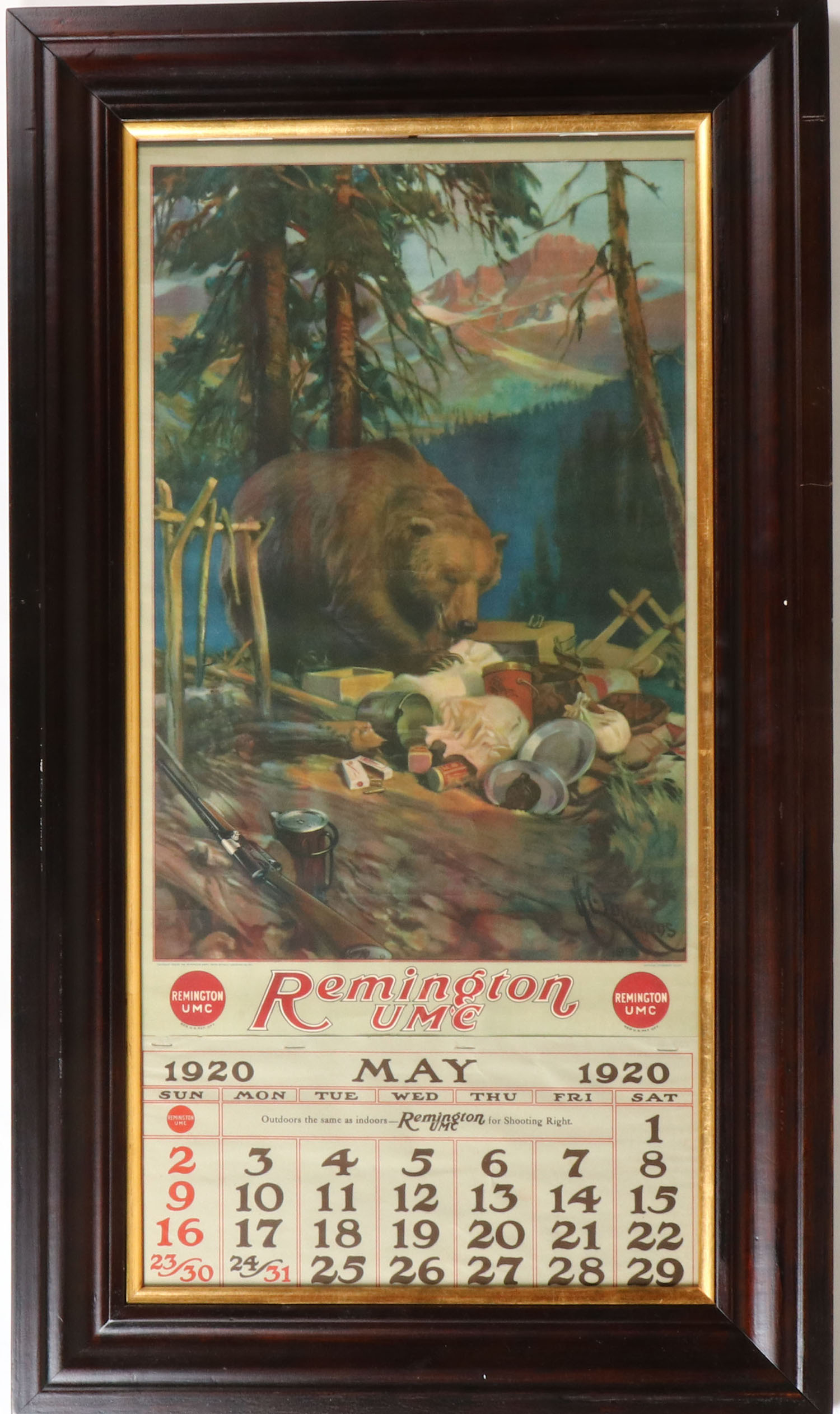 1920 Remington UMC Calendar, by H.C. Edwards, pictures a great full color image of a large grizzly bear raiding a camp site with mountains in background & a rifle up close, has metal band with brass hanger, has great colors with almost no wear, 13 7/8'' x 20 7/8'', framed. Grade: Excellent + - Value: 1500 to 4000