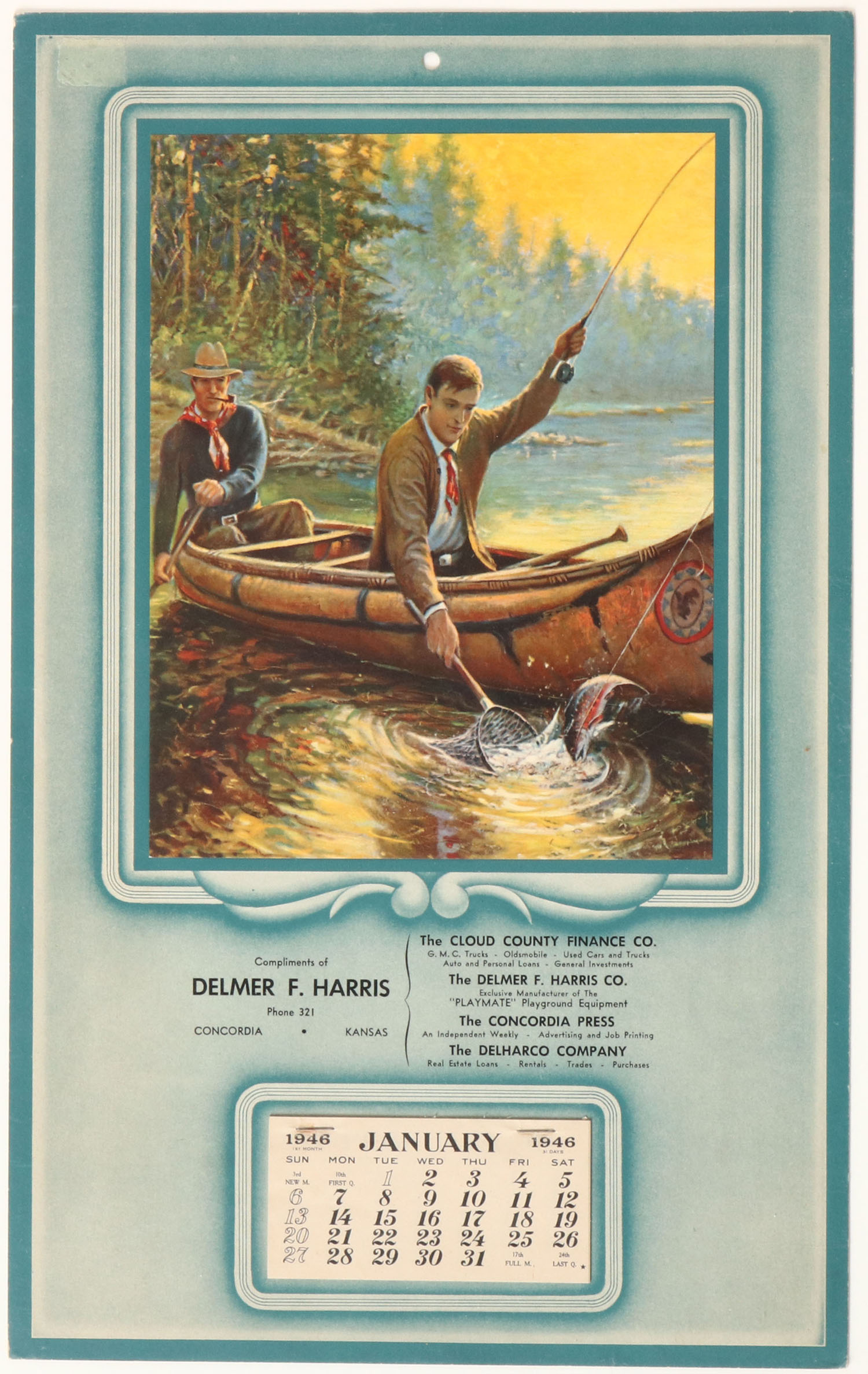 1946 brook trout calendar with two fishermen in birch canoe landing a brook trout, 10 1/2'' x 16 3/4'', full pad of pages. Grade: Excellent ++ - Value: 20 to 100