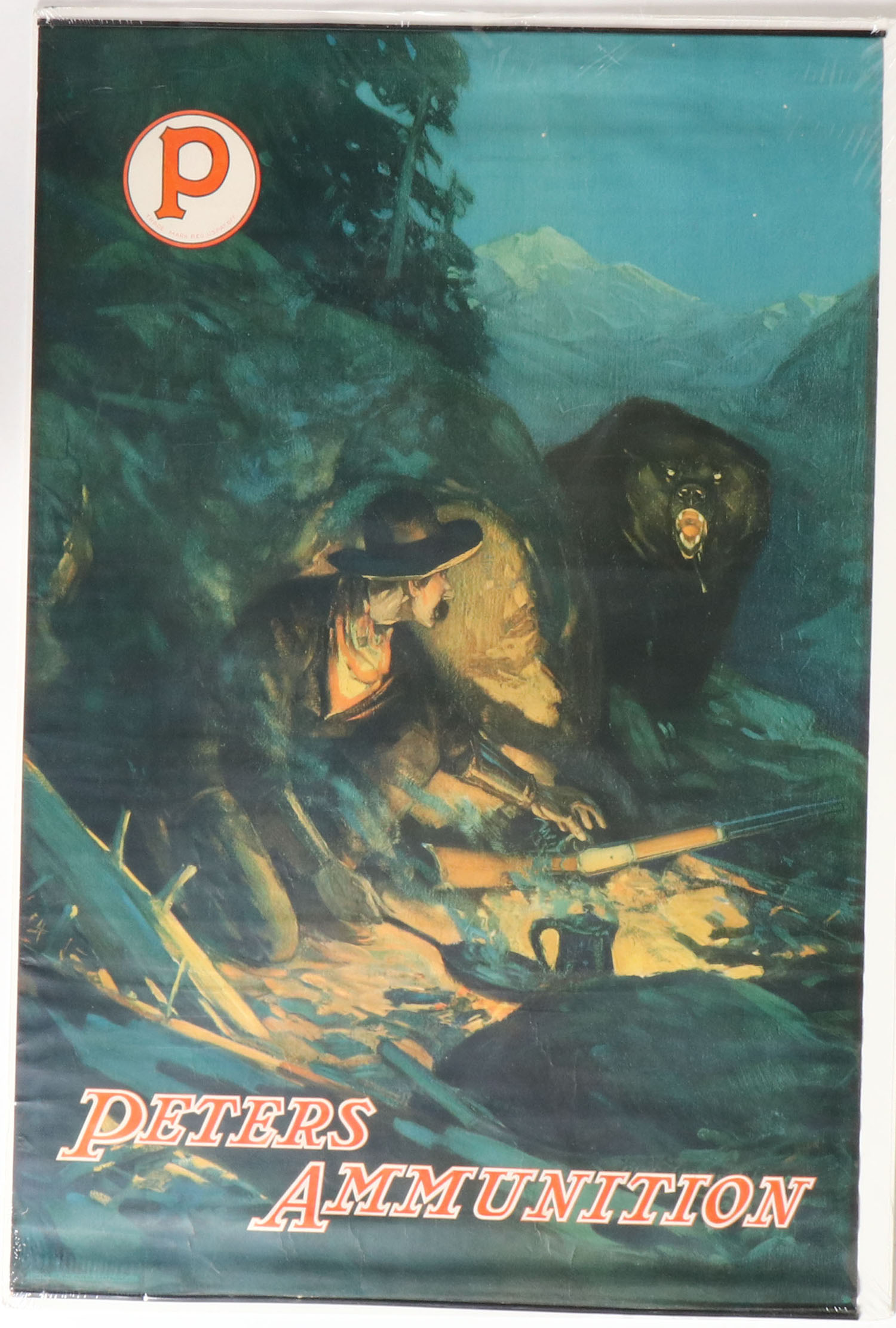 Peters Poster pictures a night scene with camp fire and a grizzly bear attacking hunter, this is a dark image to begin with but this one ins the best we have seen & not very many come to auction!, has metal bands top & bottom with brass hanger, 20'' x 30 1/4'', no edge wear & just a few light creases to bottom. Grade: Excellent + - Value: 1000 to 3000