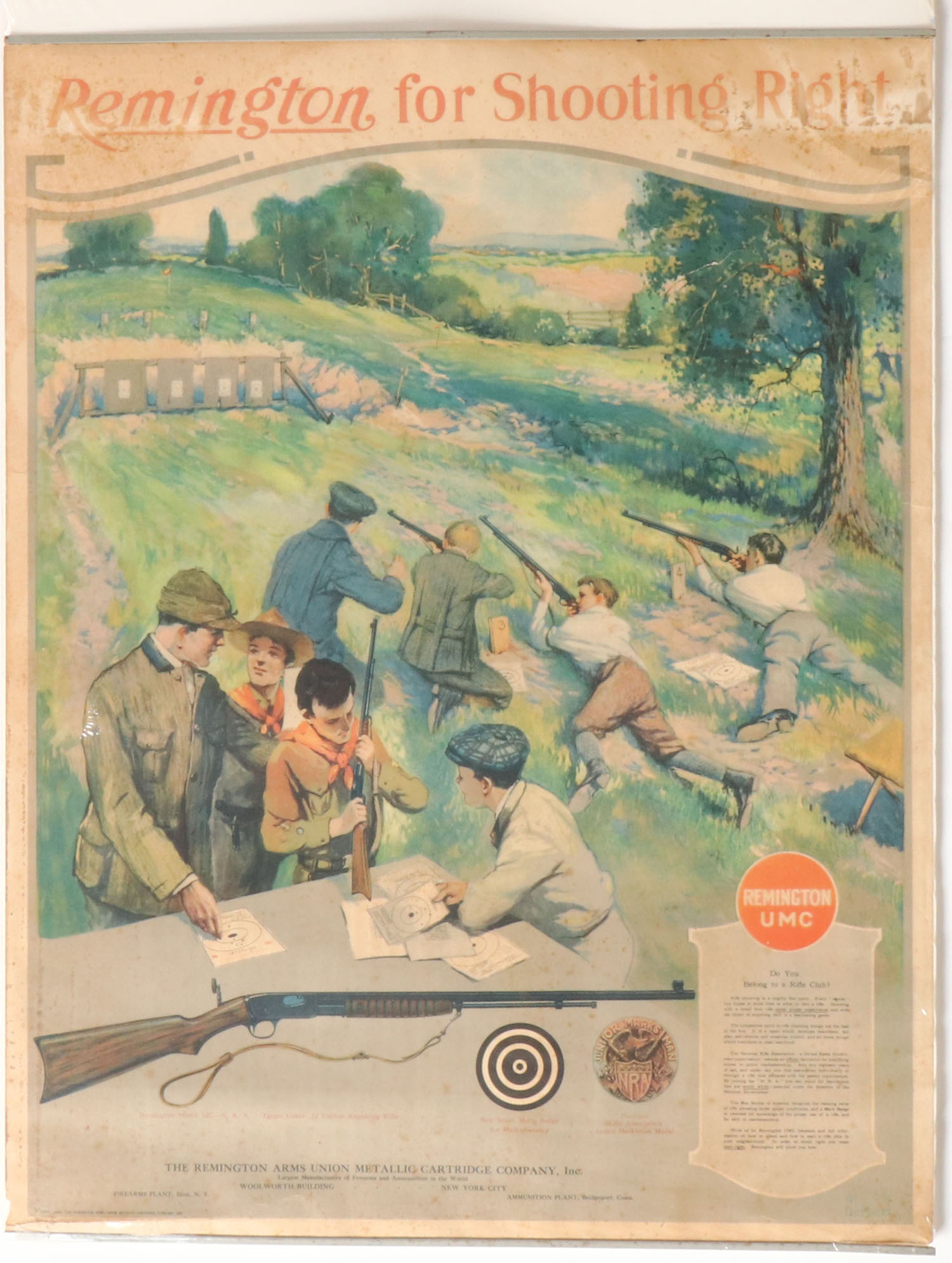 RARE Remington UMC Poster, ''REMINGTON FOR SHOOTING RIGHT'', Pictures boy Scouts shooting at targets with instructions, has Junior Marks Man NRA metal, nice color image with age spots & some fading to top right, has metal bands top & bottom with brass hanger, 20 1/8'' x 26 1/4'', first one we have seen! Grade: Very Good - Value: 500 to 2000
