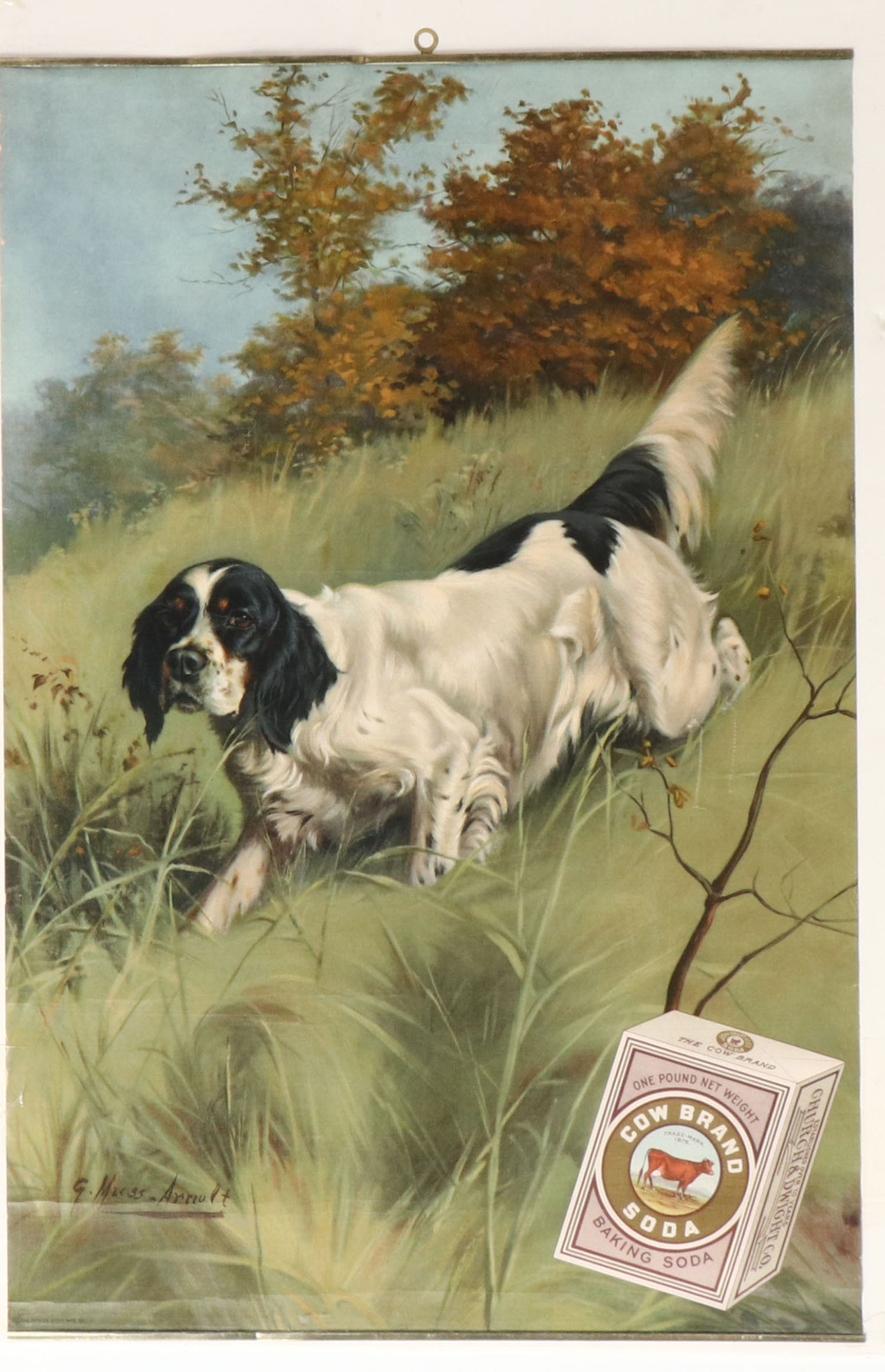 G. Muss Arnolt Poster of English Setter on point promoting Cow Brand Soda, has fantastic colors with almost no wear, has metal bands top & bottom with brass hanger, 16 3/4'' x 25 1/4''. Grade: Excellent ++ - Value: 200 to 800