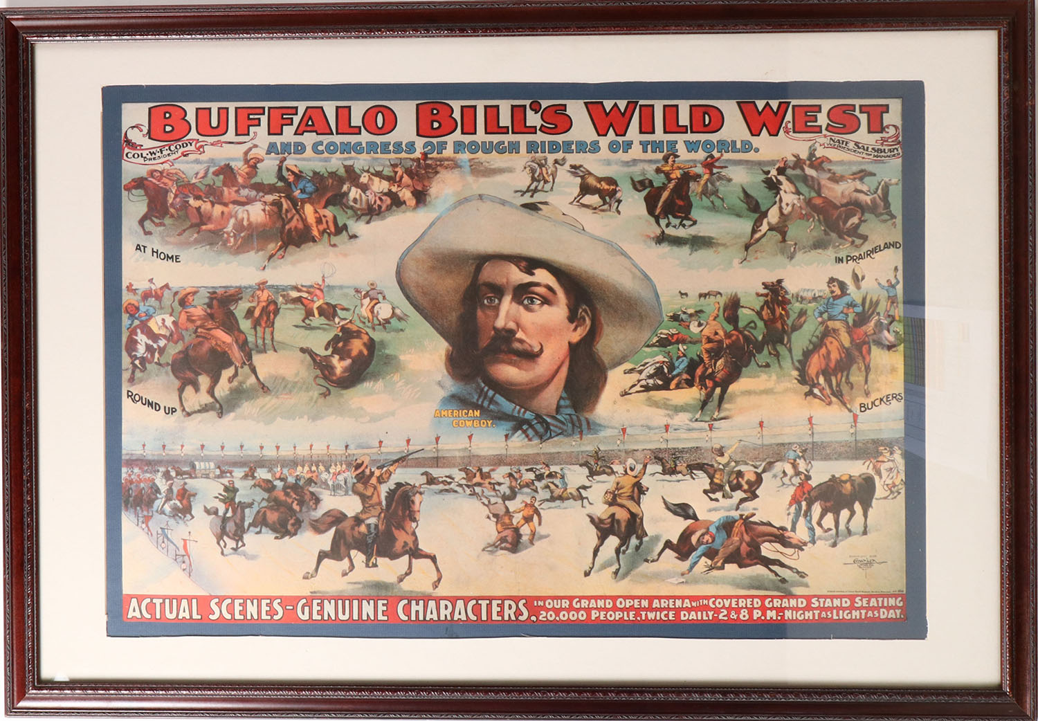 RARE 1896 BUFFALO BILL'S WILD WEST Poster, 100% all original, wonderful full color images of the show with a large center piece on Buffalo Bill in center, 31 1/4'' x 20 3/4'' image size, framed & matted. Grade: Excellent - Value: 500 to 2000