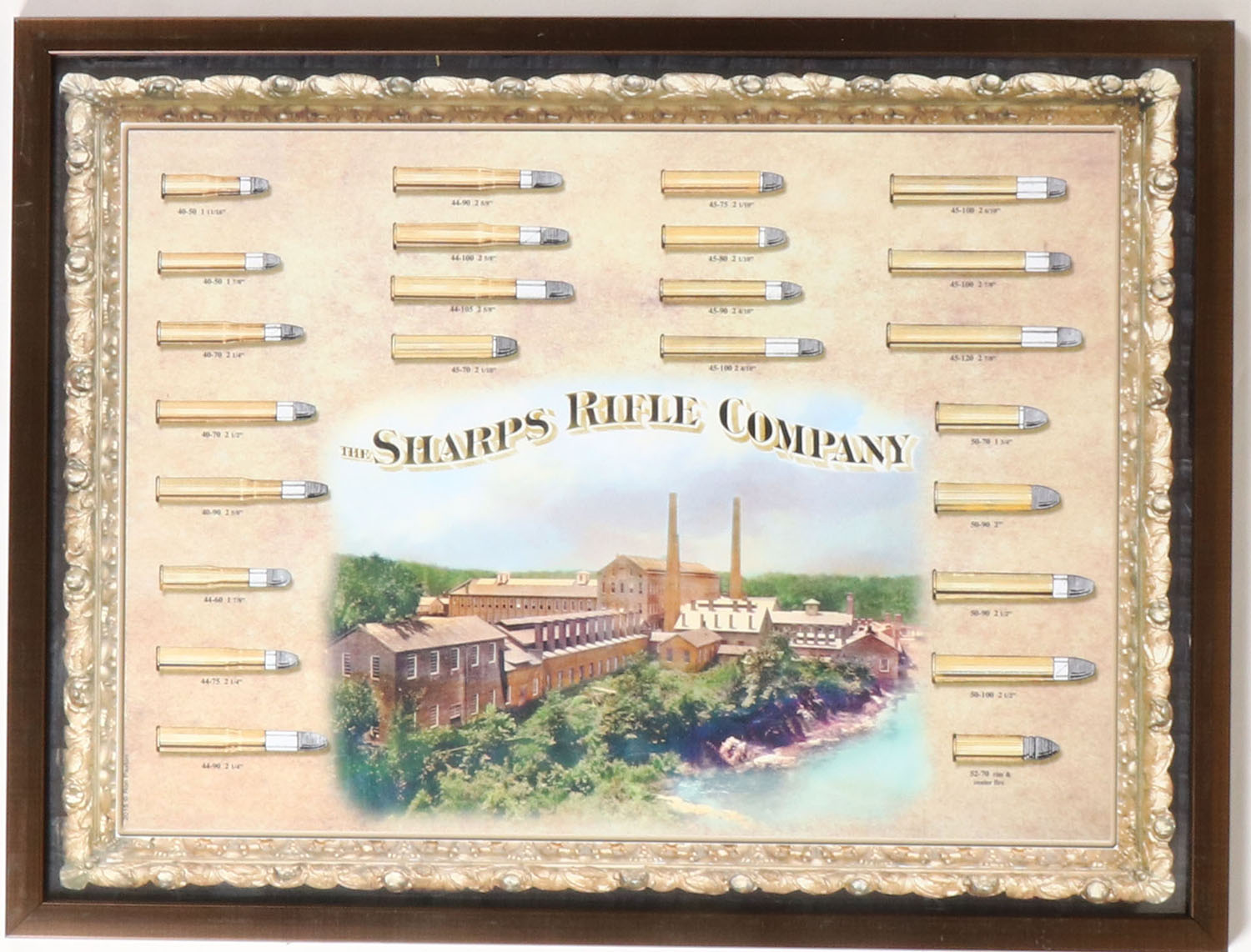 Sharps Rifle Co Poster, has beautiful colors of factory on rivers edge & many cartridges, 23'' x 17'', framed. Grade: Excellent - Value: 100 to 300