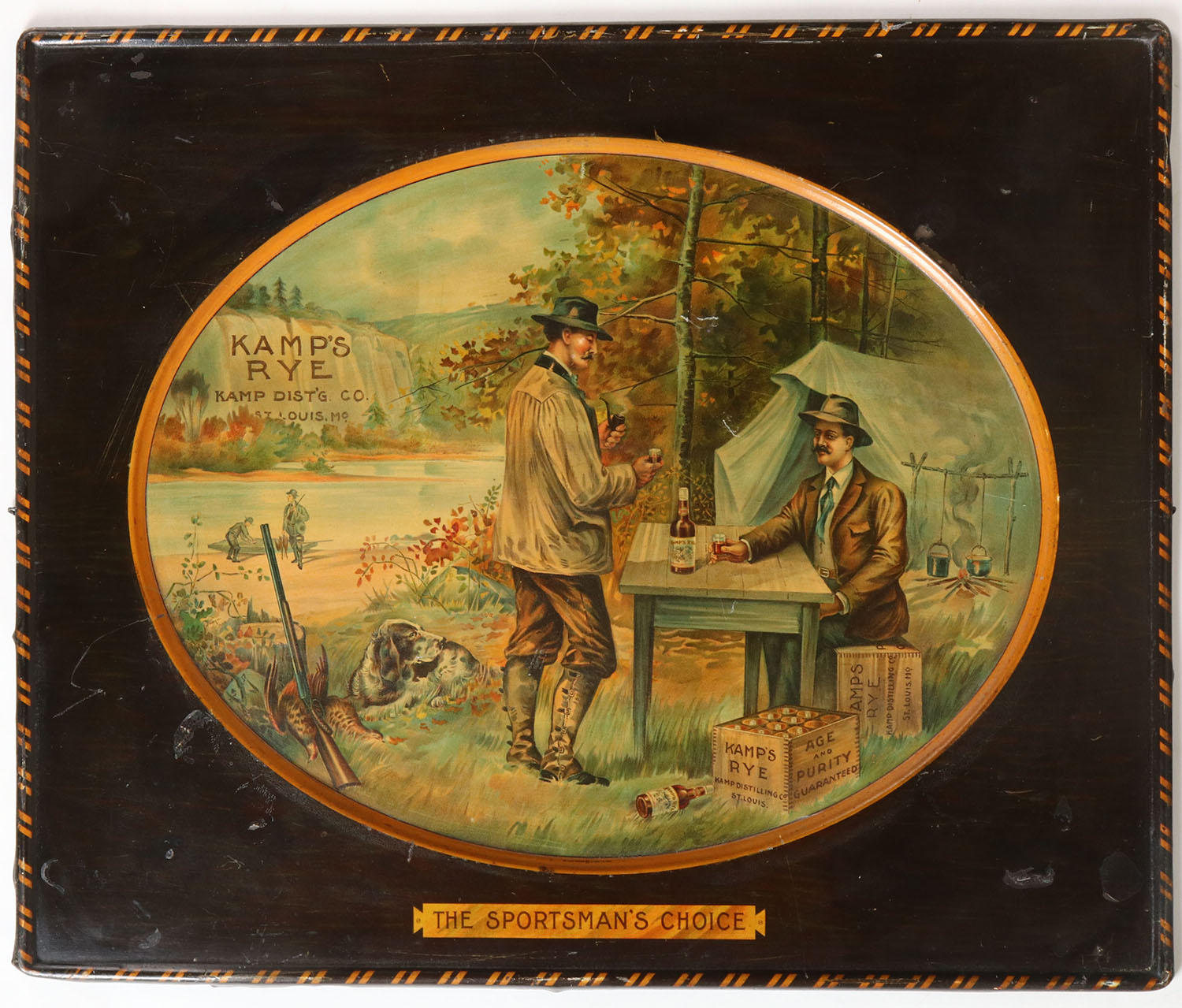 Kamp's RYE Kamp Dist'g Co. St Louis MO Embossed metal sign, ''THE SPORTSMAN'S CHOICE'', has great full color image of hunters coming back to camp with cases of Rye Whisky to drink, also pictures is a double shotgun, game birds & english setter, 24 1/4'' x 20 1/4''. Grade: Excellent - Value: 200 to 1000