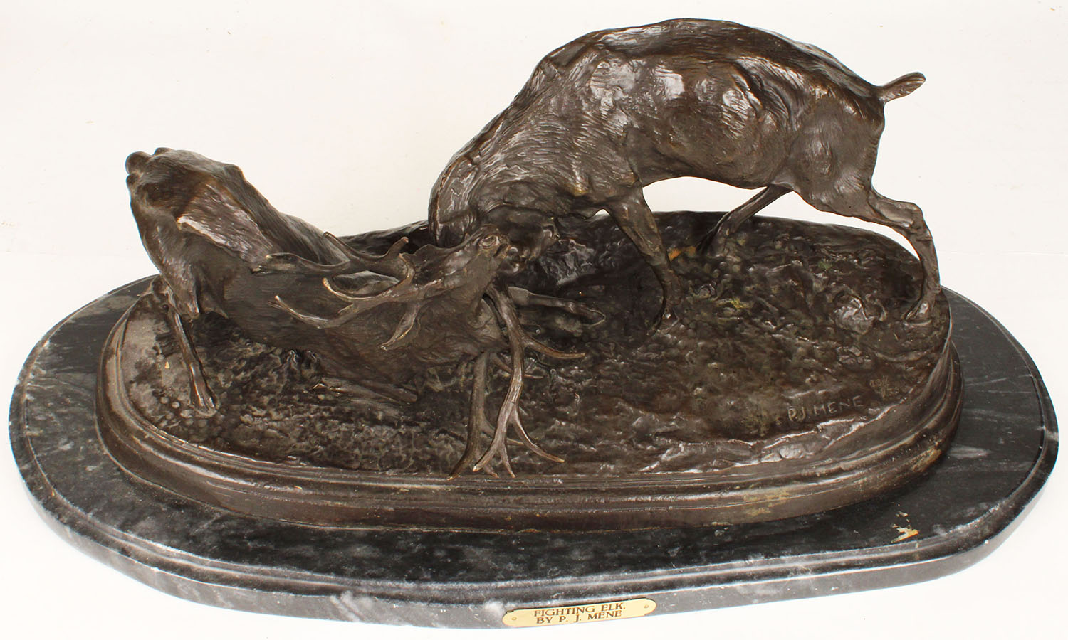 Bronze by P.J. Mene ''FIGHTING ELK'', has marble base, wonderful detail, 27'' x 11'' x 13'', also signed on base. Grade: Excellent ++ - Value: 300 to 1000