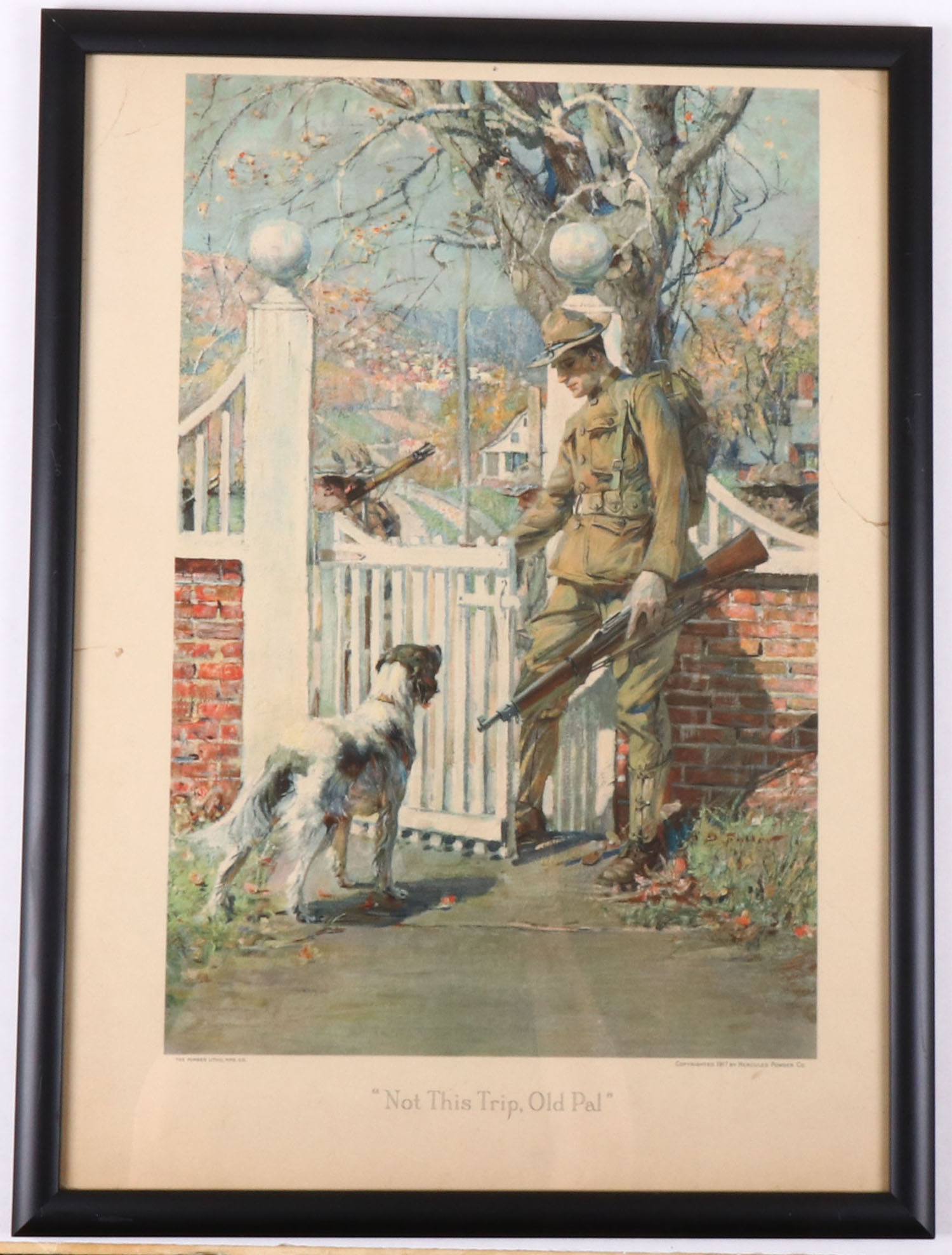 Hercules Powder Co. Poster 1917, pictures solider in uniform headed to WWI, ''NOT THIS TRIP, OLD PAL'', has nice colors with a tear to non imaged edges, 12 1/4'' x 18 3/4'' image size, framed. Grade: Very Good + - Value: 10 to 250