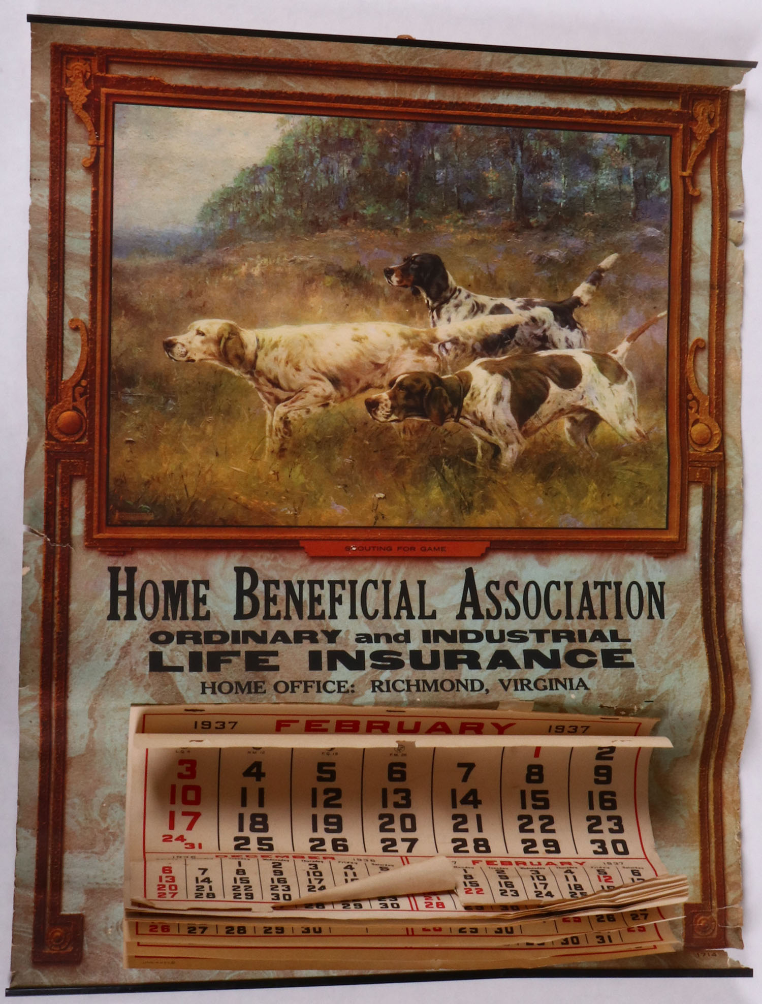 1937 Calendar pictures three hunting dogs on point, ''SCOUTING FOR GAME'', has metal bands top & bottom with paper hanger, full pad of pages, 18 1/4'' wide. Grade: Very Good ++ - Value: 20 to 100