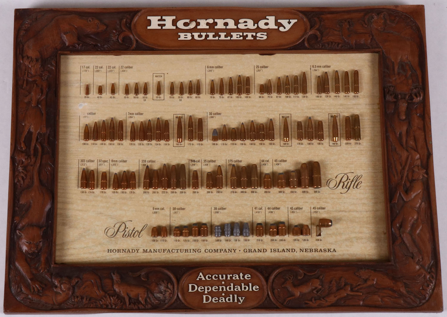 Hornady Bullet Board, ''Accurate Dependable Deadly'', Has a 3D game scenes frame. All bullets intact. Grade: Excellent + - Value: 50 to 200