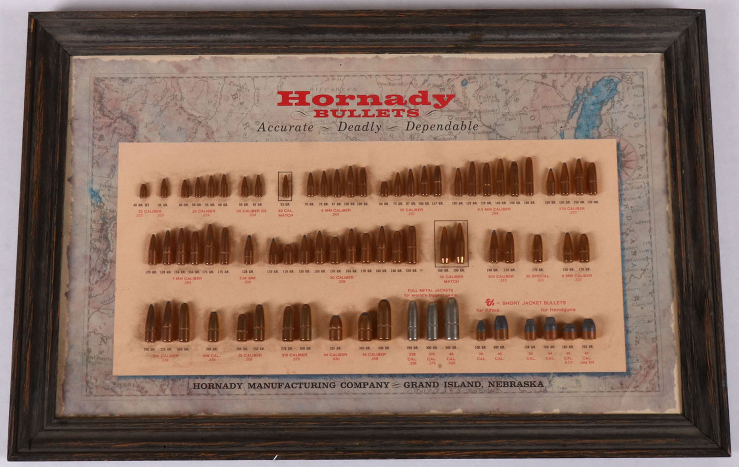 Hornady ''Accurate Dependable Deadly'' Bullet Board, pictures map in background, all bullets intact. Grade: Excellent + - Value: 50 to 200
