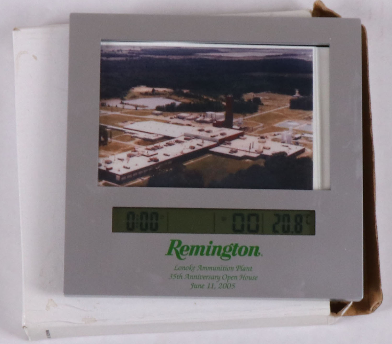 Remington Desk Top digital date, temp & clock with image of factory, 7 1/2'' Sq. Grade: Excellent - Value: 2 to 30