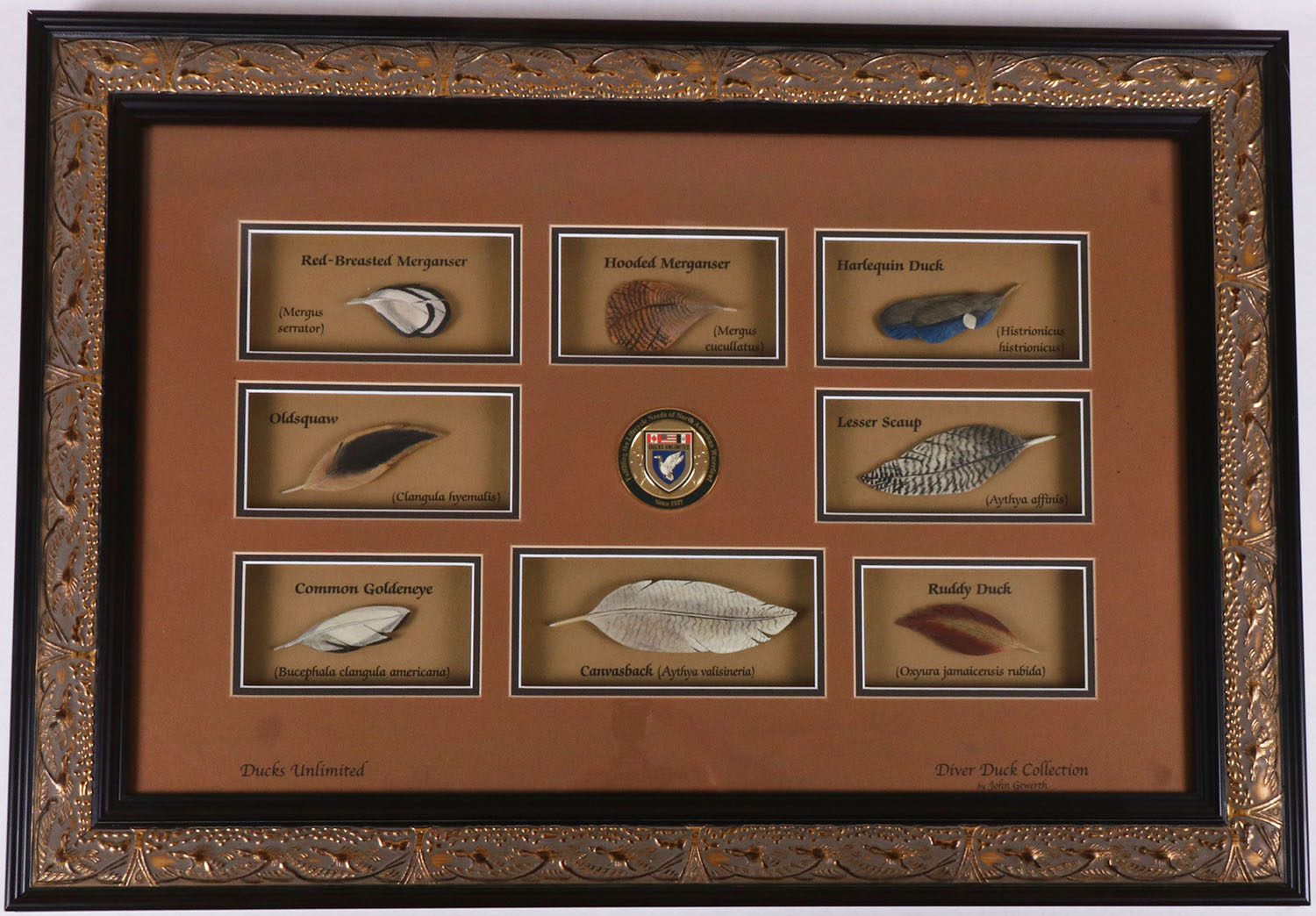 Diver Duck Collection'', each feather is hand carved & pained, each one is labeled in a shadow box, framed, 34'' x 24''. Grade: MINT - Value: 1000 to 2000