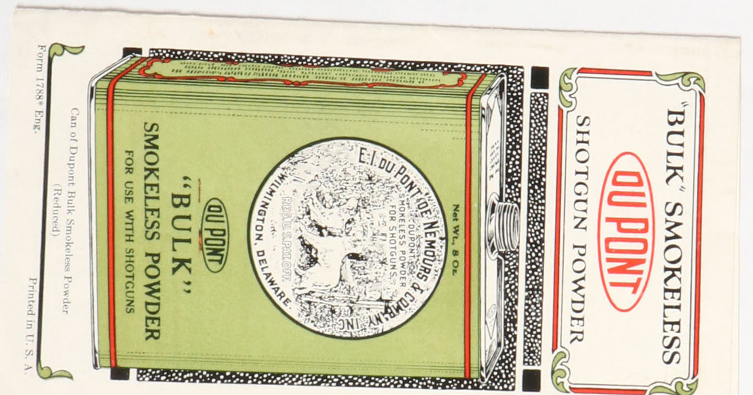 DuPont Bulk Smokeless Shotgun Powder brochure, nice image of powder tin on cover. Grade: Excellent ++ - Value: 10 to 50