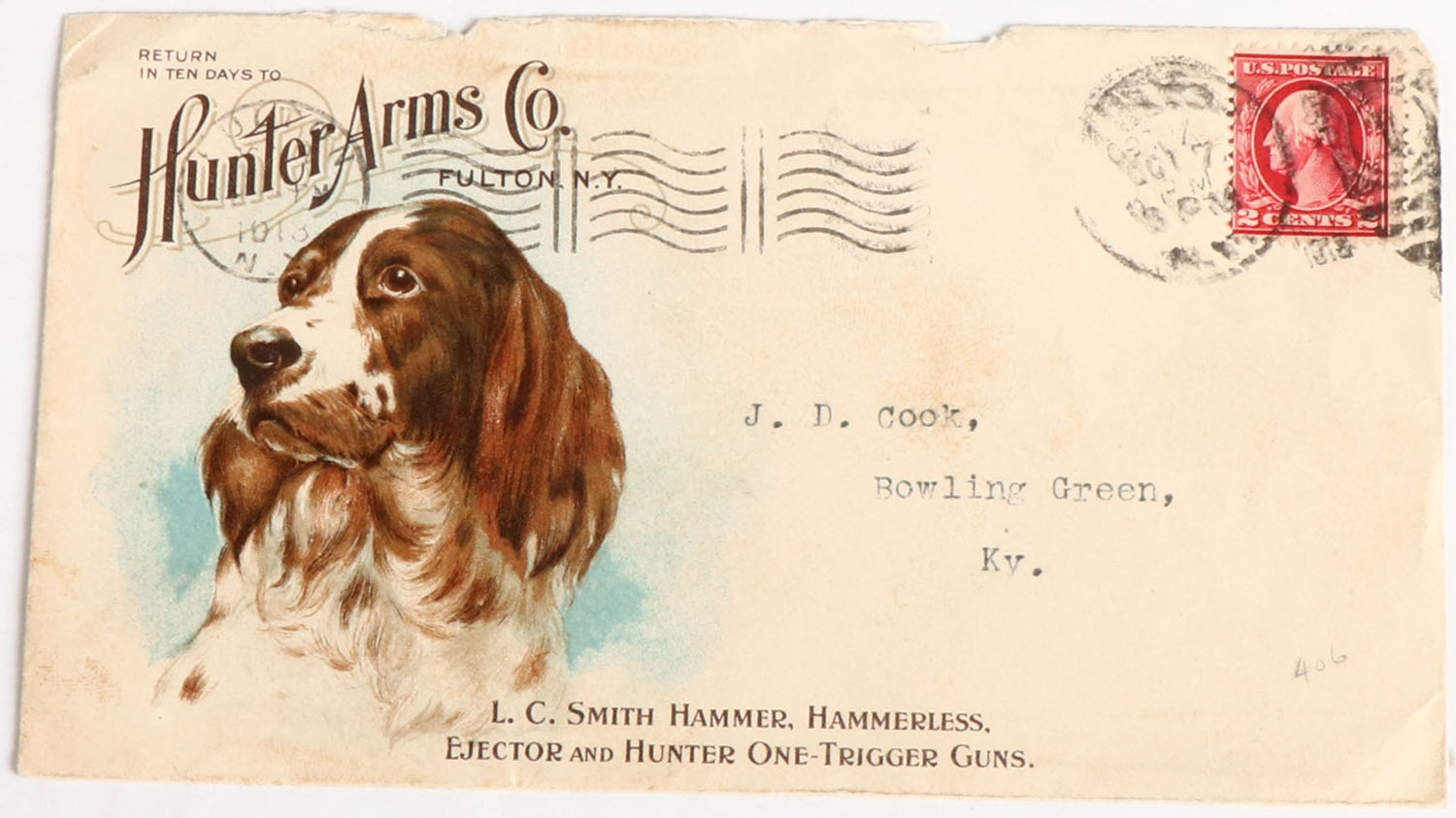 Hunter Arms Co. (L.C. Smith) Envelope, dated 1913, image of setter. Grade: Very Good + - Value: 30 to 200