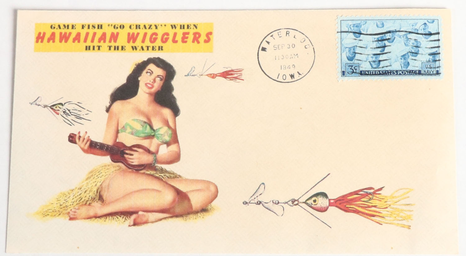 Hawaiian Wigglers Fishing Lures Envelope, dated 1949, full color image of Wahine in bikini & lures. Grade: Excellent + - Value: 6 to 50