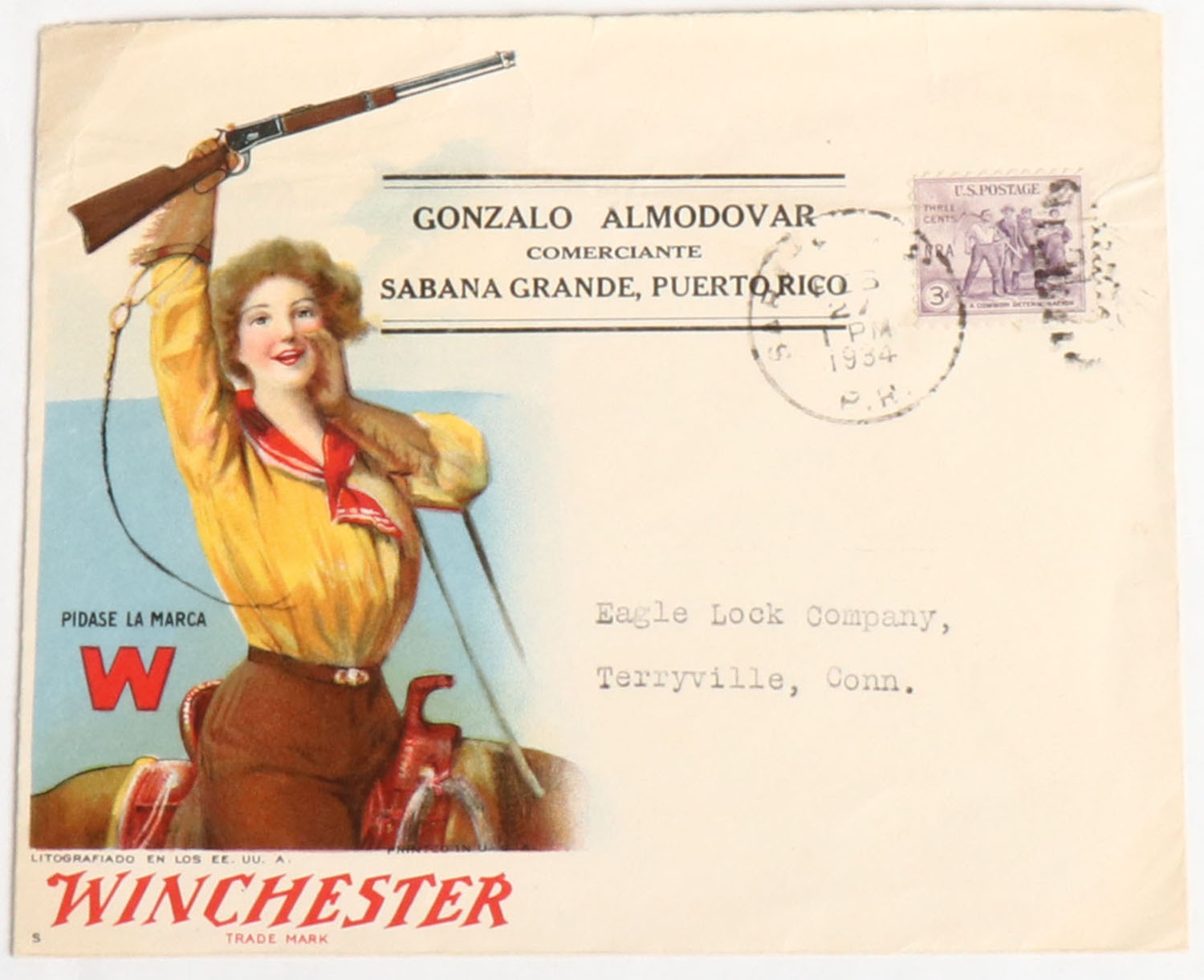 RARE Winchester Foreign Envelope from Puerto Rico, dated 1934, full color image of lady on horseback holding a lever rifle over her head. Grade: Excellent ++ - Value: 50 to 250