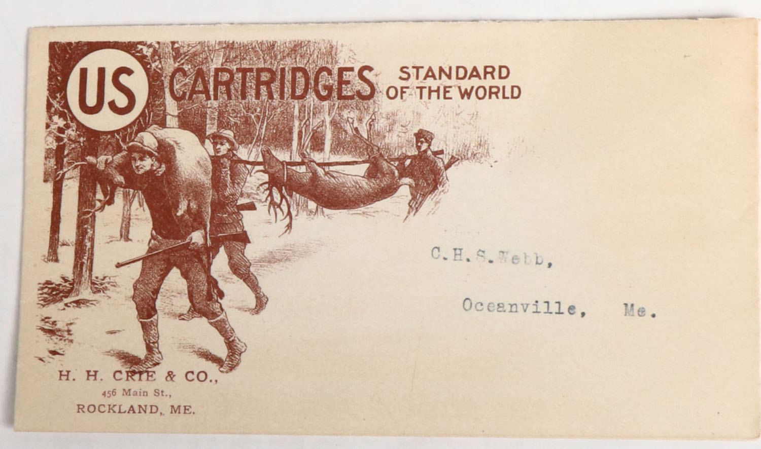 U.S. Cart. Co. Envelope pictures deer hunters bringing back two buck deer. Grade: Excellent - Value: 30 to 150