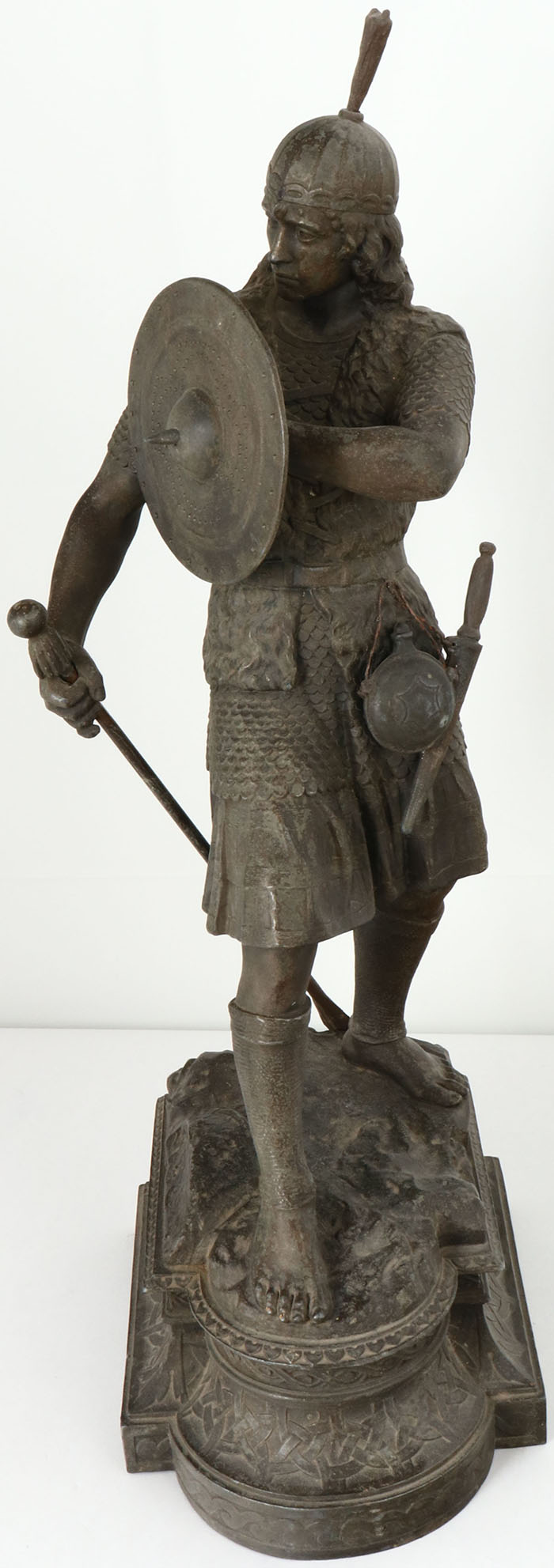 Medieval sculpture of warrior, hollow metal no name, 24'' x 7'' 7''. Grade: Excellent - Value: 10 to 500