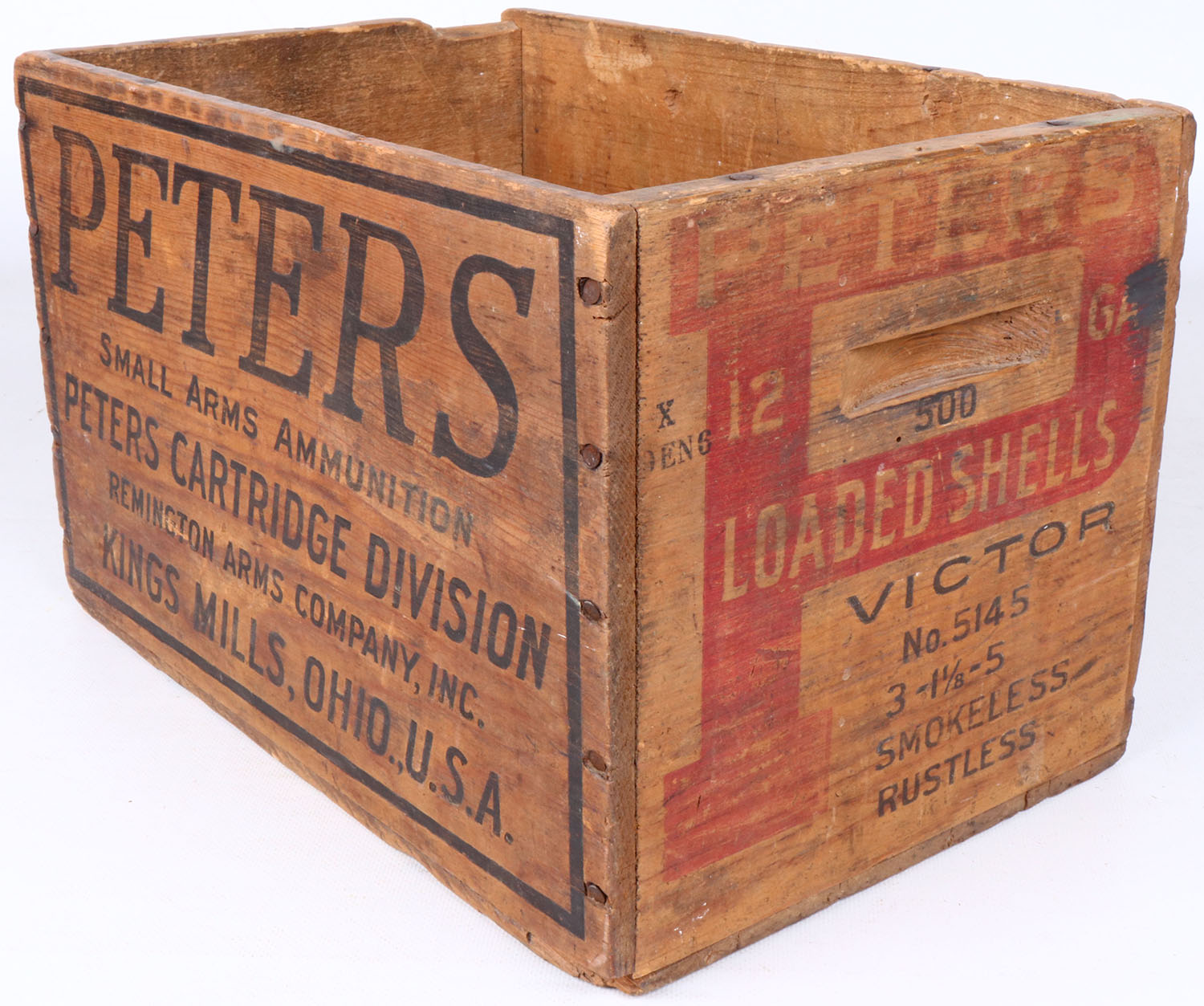 Peters Victor 12 ga., 3 - 1 1/8 - 5, nail construction, red & black print is solid, red print shows minor fading, one end has chunk missing. Grade: Very Good ++ - Value: 16 to 80
