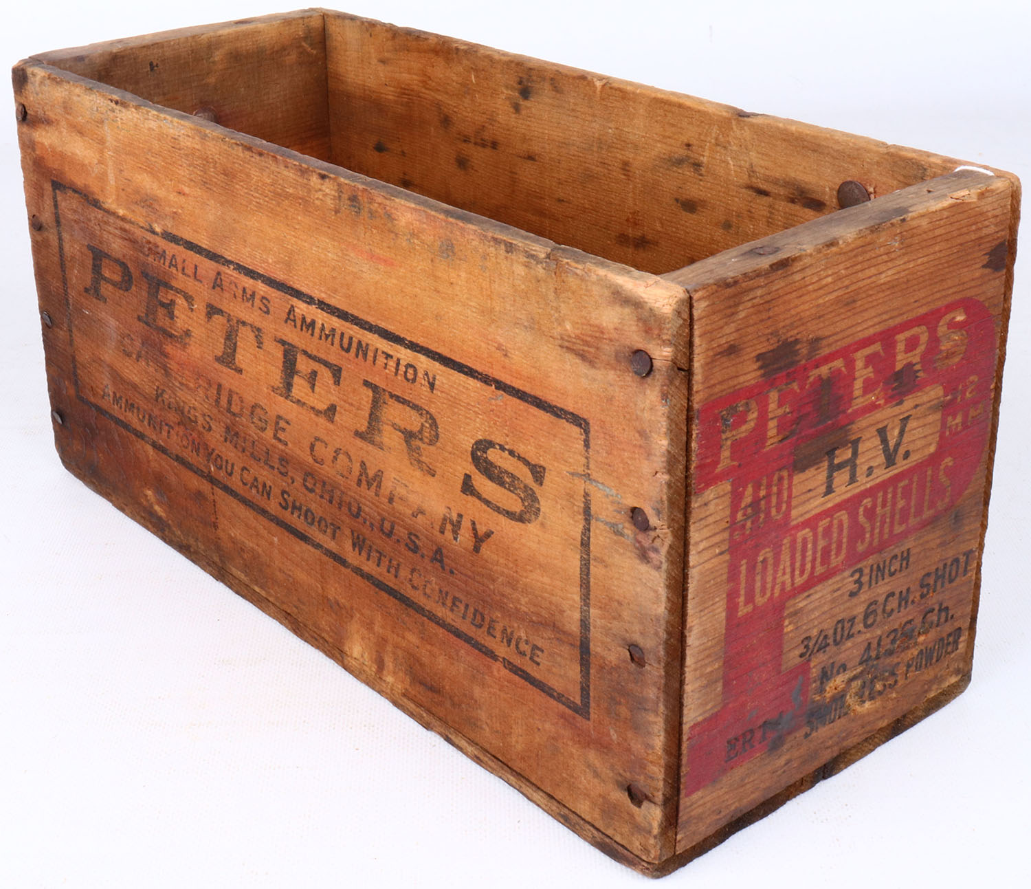 Peters High Velocity 410 ga., 3 in, 3/4 oz. 6CH., nail construction, red & black print has minor fading, crate has age soiling, overall solid. Grade: Very Good + - Value: 20 to 80