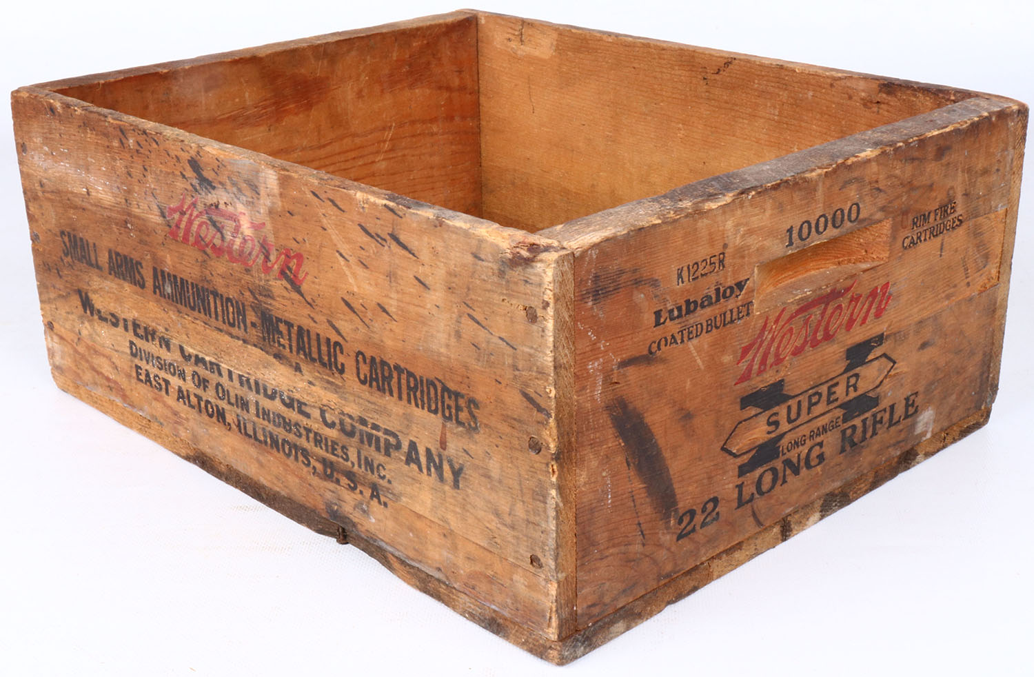 Western Super-X, .22 Long Rifle, nail construction wood shipping crate, black & red print has minor fading, has age soiling on sides & major soiling on bottom, has black markings on most sides. Grade: Good ++ - Value: 10 to 50